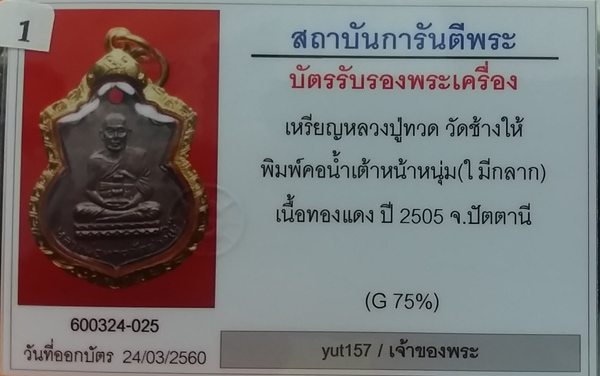 เหรียญหลวงปู่ทวด วัดช้างให้ พิมพ์คอน้ำเต้าหน้าหนุ่ม (ใ มีกลาก) เนื้อทองแดง ปี 2505 สภาพสวยเดิม เลี่ยมทองสวยงาม (G 75%) พร้อมบัตรรับรองพระแท้ครับ