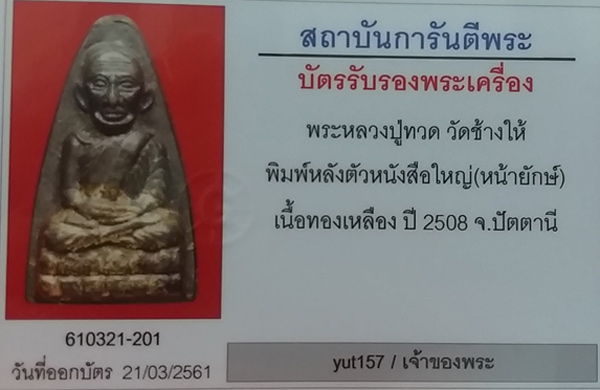 พระหลวงปู่ทวด วัดช้างให้ พิมพ์หลังตัวหนังสือใหญ่ หน้ายักษ์ เนื้อทองเหลือง ปี2508 สภาพสวยเดิม เลี่ยมทองสวยงาม พร้อมบัตรรับรองพระแท้ครับ