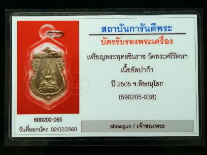 เหรียญพระพุทธชินราช วัดพระศรีรัตนฯ เนื้ออัลปาก้า ปี 2505 จ.พิษณุโลก พร้อมเลี่ยมกันน้ำรักษาผิว และบัตรรับรอง