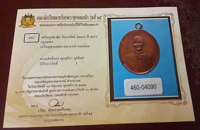 เหรียญหลวงพ่อพุ่มวัดบางโคล่รุ่นแรก2477มาพร้อมใบประกาศรางวัลที่1งานประกวดพระเครื่องและพระบูชาไทยของสมาคมพร้อมตลับทองไล้ทองคำขาวหนัก19.5กรัมสวยงามมากครับ