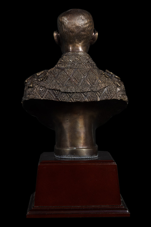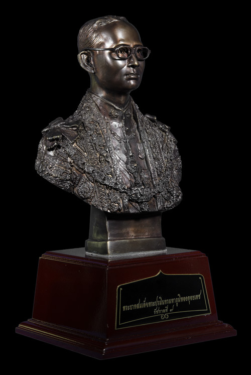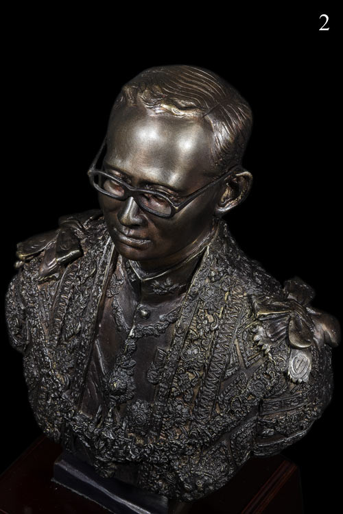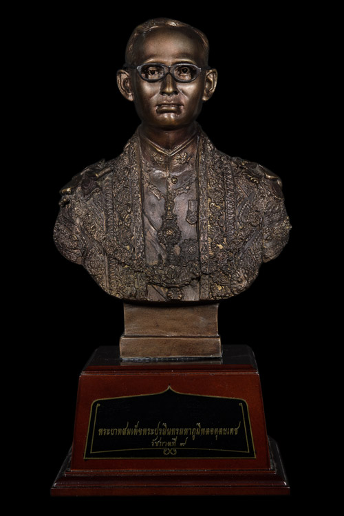 พระบรมรูปปั้น-หล่อ-ครึ่งพระองค์ ((เนื้อโลหะทองเหลือง-รมผิว)) พระบาทสมเด็จพระเจ้าอยู่หัวภูมิพลอดุลยเดช ในหลวงรัชกาลที่ 9 ((พร้อมฐานไม้)) .....พระบรมรูปองค์นี้ เป็นงานศิลป์-ประติมากรรม ปั้น-หล่อ เนื้อโลหะทองเหลืองบริสุทธิ์-รมมันปู พระบรมรูปพระบาทสมเด็จพระเจ้าอยู่หัวภูมิพลอดุลยเดช บรมนาถบพิตร ในหลวงรัชกาลที่ 9 ครึ่งพระองค์ สไตล์ อิตาลี่ ทรงเครื่องใหญ่ชุดจอมทัพไทย ฉลองพระองค์ครุยมหาจักรีบรมราชวงศ์ ทรงเครื่องขัตติยราชอิสริยาภรณ์ อันมีเกียรติคุณรุ่งเรืองยิ่งมหาจักรีบรมราชวงศ์ และสายสร้อยจุลจอมเกล้า.....ฝีมือการปั้นงานชิ้นนี้เป็นฝีมือการปั้นของช่างปั้นชั้นครู มีความเหมือนพระองค์ท่าน สวยสง่าสมส่วนพระองค์จริงมากๆ ((พิมพ์พระพักตร์ค่อนข้างหนุ่ม))ชิ้นงานมีความสวยงามสง่าสมบูรณ์......ดูพระบรมรูปองค์นี้แล้วราวกับว่าพระบรมรูปองค์นี้ทรงมีพระชนม์ชีพอยู่จริงๆ-ผลงานหล่อหุ่นรูปปั้นซึ่งเป็นโลหะออกมาได้ดูอ่อนช้อยมีชีวิตชีวามาก..... ......มีน้ำหนักมากรวมถึง 5-6 กิโลกรัม.....ขนาดองค์พระบรมรูป+ฐานไม้ใหญ่ประมาณ (ยังไม่รวมวัสดุป้องกันองค์พระรูป) จะมีขนาดเป็นลูกบาศก์ ราวๆ 9X9X14 นิ้ว....แล้วยังต้องหุ้มโฟมแข็งรอบๆเพื่อป้องกันพระบรมรูปชำรุดในการจัดส่งอีก......รวมๆแล้วจะมีความใหญ่ของกล่องราวๆ.....ขนาดลังเบียร์จุขวดใหญ่ 1 โหล จำนวน 1.5 ลัง เป็นอย่างน้อยครับ..... ......พระบรมฉายาลักษณ์ที่ครูช่างท่านนำมาเป็นต้นแบบในการปั้นเป็นหุ่นพระบรมรูปพระองค์นี้นั้น.....น่าจะเป็นพระบรมฉายาลักษณ์ที่ทรงฉายไว้ในช่วงที่พระองค์ทรงมีพระชนมายุกำลังอยู่ในรอบที่ 4 (คือช่วงอายุ 37-48 ปี) หรือระหว่างปี พ.ศ.2507-2518 ครับ