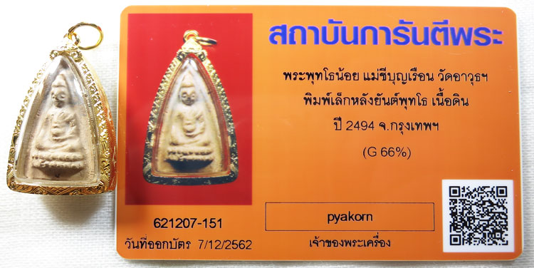 พระพุทโธน้อย แม่ชีบุญเรือน วัดอาวุธฯ พิมพ์เล็กหน้าตุ๊กตานิยม เลี่ยมทองยกซุ้มพร้อมใช้ หลังยันต์พุทโธ เนื้อดิน ปี 2494 สภาพสวยจมูกสรพงศ์ ไม่ผ่านการใช้ มาพร้อมบัตรรับรองแบบแข็ง มี QR โค้ดของการันตีพระตรวจสอบง่าย รับประกันพระสวยๆ แท้ๆ แบบสากล และตามกฎครับ