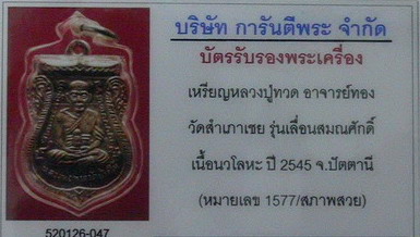 เหรียญเลื่อนสมณศักดิ์ อ.ทอง วัดสำเภาเชย ปี 45 เนื้อนวโลหะ สภาพสวยเดิม หมายเลข 1577 พร้อมบัตรรับรองพระเครื่อง ค่ะ