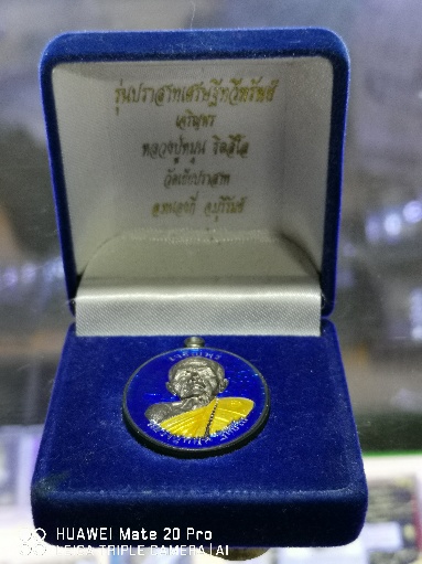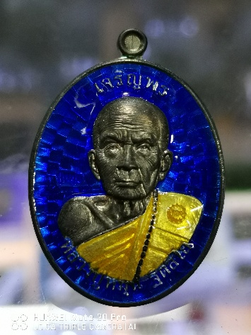เหรียญเจริญพร หลวงปู่หมุน ฐีตสีโล วัเย้ยปราสาท รุ่นปราสาทเศรษฐีทวีทรัพย์ เนื่อเงินลงยาสีน้ำเงินจีวรทอง ตอกโค๊ต ตอกหมายเลข12 ปี2557 จัดสร้างน้อย