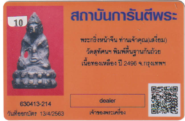 | พระกริ่งหน้าจีนเจ้าคุณเสงี่ยม วัดสุทัศน์ กทม. ปี 2486 พิมพ์ตื้นฐานก้นถ้วย (พร้อมบัตรรับประกันพระแท้ในบัตรพศ.ผิดหิดหน่อยครับ)