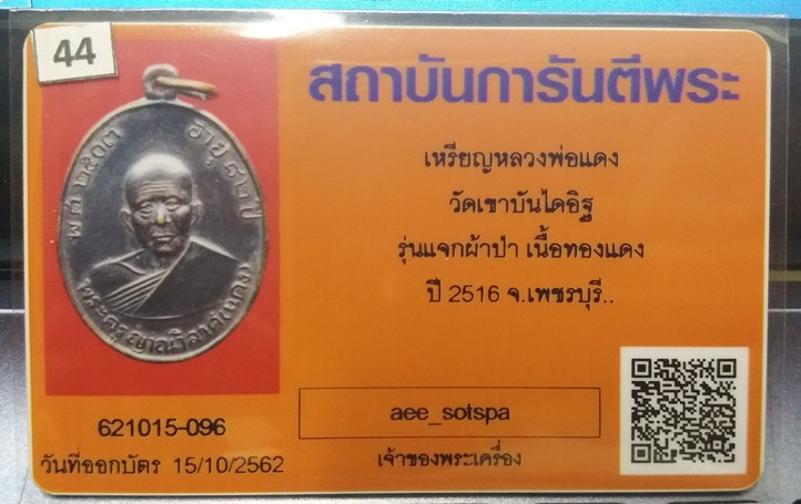 เหรียญหลวงพ่อแดงวัดเขาบันไดอิฐ รุ่น แจกผ้าป่า บล็อกนิยม เจ็ดหางกระรอก เนื้อทองแดง ปี 2516 สภาพสวย พร้อมบัตรรับรอง และ ใบประกาศที่1 งานเซ้นทรัลพลาซ่า เวสต์เกต