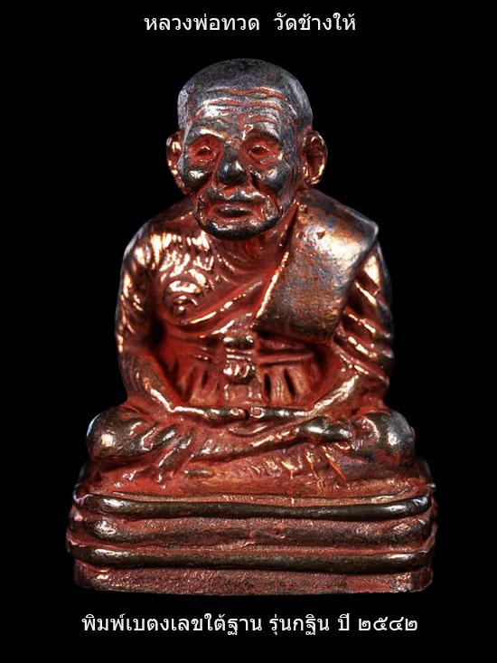 รูปหล่อหลวงปู่ทวดพิมพ์เบตงเลขใต้ฐาน วัดช้างให้ เนื้อนวโลหะ รุ่นกฐิน 2542 หมายเลข ๓๗๘ หลวงพ่อทวด รุ่นนี้ทางวัดช้างไห้จัดสร้างขึ้นเป็นพิเศษ โดยใช้พิมพ์หลวงพ่อทวดรูปหล่อลอยองค์พิมพ์เบตงใต้ฐาน ปี 2505 ที่ท่านสวัสดิ์ฯผู้พิพากษาศาลจ.ยะลา (ในขณะนั้น) เป็นผู้จัดสร้าง ของวัดช้างไห้ เป็นแบบ เป็นเนื้อนวโลหะเข้มข้นแก่ทอง เนื่องจากรุ่นนี้ได้ผสมทองคำลงไปเป็นจำนวนมาก ที่ผิวองค์พระจะมองเห็นกระแสทองชัดเจน เมื่อผิวสัมผัสกับอากาศ ผิวจะกลับดำ และมันเงา องค์พระมียาขัดสีแดง ๆ ทั่วองค์ ใต้ฐานตอกโค้ดและหมายเลขกำกับไว้ทุกองค์ ( สร้างจำนวน ๒๕๔๒ องค์ ) มวลสารผสมก้านชนวนจากการสร้างพระหลวงพ่อทวดรุ่นเก่าๆ หลายรุ่น ขนาด สูง 2.6 เซ็นติเมตร ฐานกว้าง 2.0 เซ็นติเมตร จัดพิธีพุทธาภิเษก 20 พฤศจิกายน 2542 มีอาจารย์นอง วัดทรายขาว และเกจิอาจารย์ชื่อดังสายใต้ในยุคนั้นหลายท่านร่วมกันปลุกเสกมากมาย เป็นที่ยอมรับกันว่าเป็นสุดยอดด้านการปลุกเสกหลวงพ่อทวด ปัจจุบันพระหลวงพ่อทวดรุ่นนี้ กำลังเป็นที่ต้องการของผู้นิยมสะสมพระหลวงพ่อทวด ปัจุบันเริ่มหายาก และพบเห็นเจอในวงการพระน้อยแล้ว เนื่องจากสร้างน้อย ออกแบบได้สวยมาก มีพุทธคุณสูง และเจตนาการสร้างดีมากๆครับ *** องค์นี้หมายเลข ๓๗๘ เป็นหลวงพ่อทวดอีกรุ่นที่น่าสะสมมาก ด้วยรูปแบบ ชนวนมวลสาร และพิธีในการสร้างที่สุดยอดมาก คาดว่าเป็นอีกรุ่นที่ในอนาคตจะมีค่านิยมในการเล่นหาสูงขึ้นครับ ***