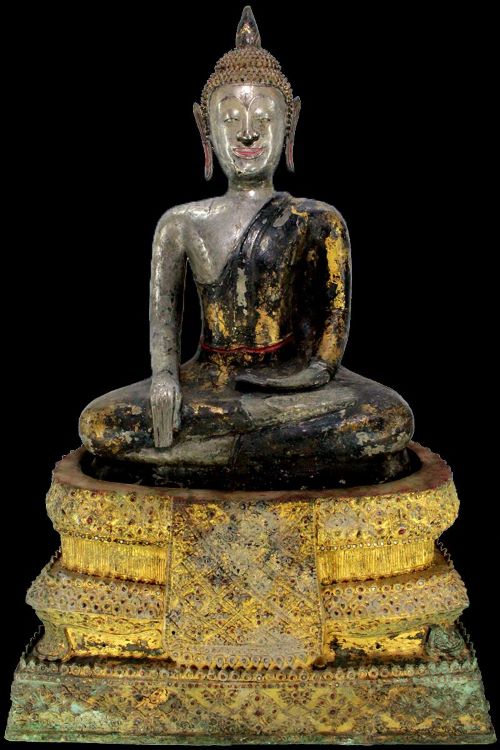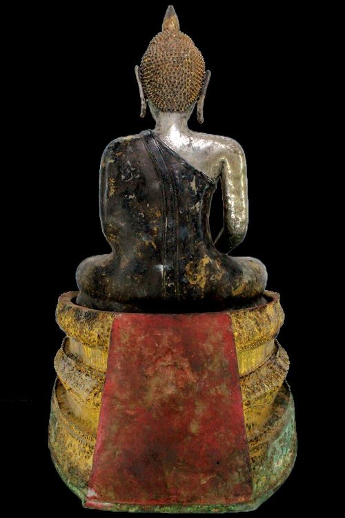 พระบูชาสมัยอยุธยา ปางมารวิชัย ยุคราชวงค์บ้านพลูหลวง หน้าตัก 12 นิ้ว เนื้อโลหะสัมฤทธื์แก่เงิน วางบนฐานพระยุครัตนะตอนต้น สุดยอดหายาก