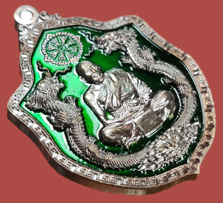 เหรียญมังกรคูู่ รุ่นรวยสมปราถนา หมายเลข ๑๒ เนื้อ ทองแดงมันปูลงยาเขียว เหนี่ยวทรัพย์ จำนวนสร้าง ๑๙๙ องค์ หลวงปู่แผ้ว ผลปัญโญ เทพเจ้าแห่งตักศิลาใสหลวง จ.พัทลุง