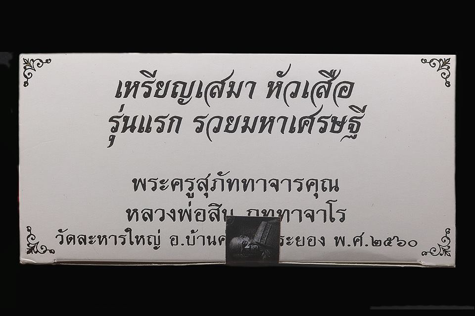เหรียญเสมาหัวเสือหลวงพ่อสินรุ่นแรก รวยมหาเศรษฐี จัดสร้างปี 2560 ชุดกรรมการสร้างจำนวน 1,599 ชุด ใน 1 ชุดกรรมการรับพระ 6 เหรียญ ประกอบไปด้วย 1.เนื้ออัลปาก้าหน้าฝาบาตร ขอบทองแดงลงยา 3 สี (3 K) 2.เนื้อแร่หน้าอัลปาก้า ขอบฝาบาตรลงยา 3 สี (3K) 3.เนื้อชนวนหน้าฝาบาตร ลงยา 3 สี 4.เนื้อทองฝาบาตรหน้าอัลปาก้า ลงยา 3 สี 5.เนื้อทองแดงไม่ตัดปีกตอกโค๊ต ๙ รอบ 6.เนื้อทองฝาบาตรไม่ตัดปีก ชุดนี้ยังไม่เปิดซีลสภาพกล่องสวยกริ๊ปเอาไปลุ้นเลขสวยๆกันเองเลยค่ะ