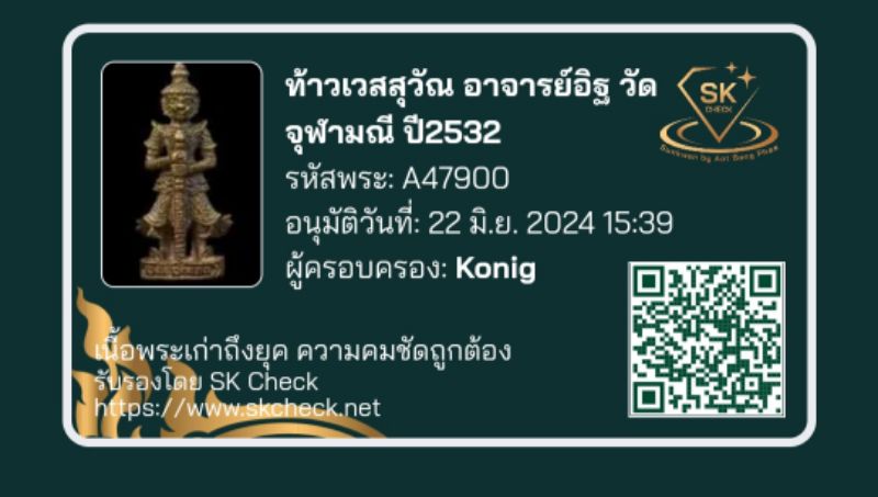 ท้าวเวสสุวรรณรุ่นแรก ของวัดจุฬามณี มีพิธีเททองในวันที่ 29 ธันวาคม 2531 จำนวนจัดสร้าง300องค์ พิธีพุทธาภิเษก วันที่ 15 กรกฎาคม 2532 พระคณาจารย์ร่วมปลุกเสก ดังนี้ 1 หลวงพ่อสุธรรม วัดเขาพระ (ประธานเททอง) 2 หลวงพ่อแผ่ว วัดโตนดหลวง 3 หลวงพ่อแช่ม วัดดอนยายหอม 4 หลวงพ่อลำใย วัดทุ่งลาดหญ้า 5 หลวงพ่ออุตตมะ วัดวังก์วิเวการาม 6 หลวงพ่อหยอด วัดแก้วเจริญ 7 หลวงพ่อเก๋ วัดแม่น้ำ 8 หลวงพ่อวิไล วัดโพธิ์งาม 9 หลวงพ่ออุดม วัดปทุม ประวัติท้าวเวสสุวรรณ ท้าวเวสสุวรรณ เป็นอธิบดีแห่งอสูรย์หรือยักษ์ หรือเป็นเจ้าแห่งผี เป็นหนึ่งในบรรดาท้าวจตุโลกบาลทั้งสี่ ผู้คุ้มครองและดูแลโลกมนุษย์ สถิตอยู่บนสวรรค์ชั้นจาตุ ทรงอิทธิฤทธิ์อานุภาพมากประทับ ณ โลกบาลทิศเหนือมียักษ์เป็นบริวาร คนไทยโบราณนิยมนำผ้ายันต์รูปยักษ์ผูกไว้ที่หัวเตียงเด็ก เพื่อป้องกันวิญญาณชั่วร้ายไม่ให้มารังควาญแก่เด็กว ท้าวกุเวรองค์นี้มีกล่าวถึงในอาฏานาฏิยปริตว่านำเทวดาในสวรรค์ชั้นจตุมหา ราชิกา มาเฝ้าพระพุทธเจ้าและได้ถวายสัตย์ที่จะดูแลพระพุทธเจ้าและเหล่าสาวก ไม่ให้ยักษ์หรือบริวารอื่นๆ ของท้าวจตุโลกบาลไปรังควาญ ท้าวเวสสุวรรณ เป็นหนึ่งในบรรดาท้าวจตุโลกบาลทั้งสี่ ผู้คุ้มครองและดูแลโลกมนุษย์สถิตอยู่บนสวรรค์ชั้นจาตุมหาราชิกา ซึ่งมีท้าวมหาราชทั้งสี่ปกครอง คือ ท้าวธตรัฏฐะ ท้าววิรุฬหกะ ท้าววิรูปักชะ และท้าวเวสสุวรรณ (ท้าวกุเวร) ประจำทิศต่างๆ ทั้งสี่ทิศโดยเฉพาะท้าวเวสสุวรรณ (ท้าวกุเวร) เป็นใหญ่ปกครองบริวารทางทิศเหนือ ว่ากันว่าอาณาเขตที่ท้าวเธอดูแลปกครองรับผิดชอบมีอาณาเขตใหญ่โตมหาศาล กว้างขวาง และเป็นใหญ่ (หัวหน้าท้าวจตุโลกบาลทั้ง 4 ) กว่าท้าวมหาราชองค์อื่น ท้าวเวสสุวรรณ เป็น เทพแห่งขุมทรัพย์ เป็น มหาเทพแห่งความร่ำรวย มั่งคั่ง รักษาสมบัติของเทวโลก ทั้งเป็นเจ้านายปกครองดูแลพวกยักษ์ ภูตผีปีศาจทั้งปวง (ในคัมภีร์เทวภูมิ กล่าวไว้ว่า ท้าวเวสสุวรรณได้บำเพ็ญบารมี มาหลายพันปี รับพรจาก พระอิศวร พระพรหม ให้เป็นเทพแห่งความร่ำรวย ) นอกจากนี้หน้าที่ของท้าวเวสสุวรรณมีมากมาย เช่น การดูแลปกป้องคุ้มครองพระพุทธศาสนา, ปกป้องคุ้มครองแก่ผู้นั่งสมาธิปฏิบัติพระกรรมฐาน เป็นต้น องค์นี้สวยเดิมหายาก น่าเก็บครับ