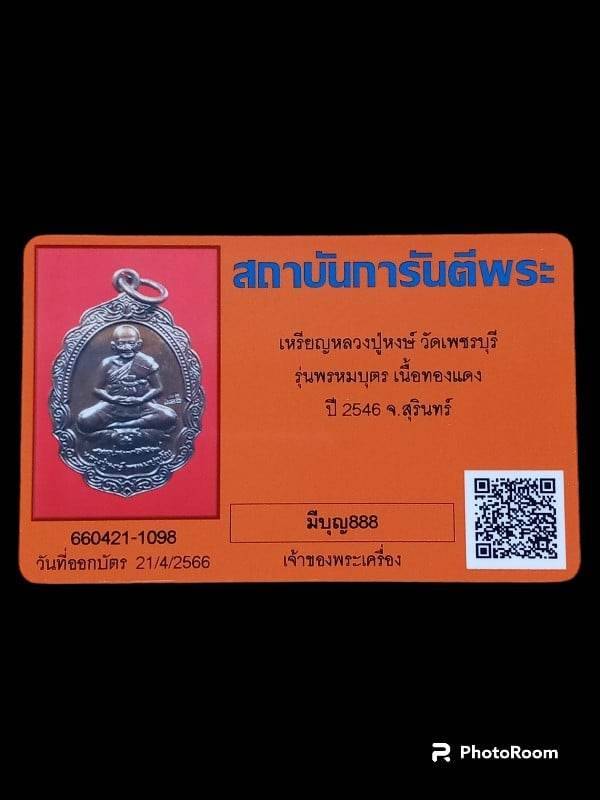เหรียญพรหมบุตร รุ่น นั่งรวย หลวงปู่หงษ์ พรหมปัญโญ สุสานทุ่งมน(วัดเพชรบุรี) จ.สุรินทร์ ปี 2546 เนื้อทองแดงผิวเดิมๆ หน้าเหรียญตอกโค้ต นะ เม ติ เหรียญนี้ตอกโค๊ตเบิ้ล ด้านหลังเป็นยันต์นางจัน เป็นเหรียญอีกรุ่นที่มีความสวยงามมาก เหรียญหลักอันดับต้นๆของหลวงปู่หงษ์ พร้อมบัตรรับรองค่ะ