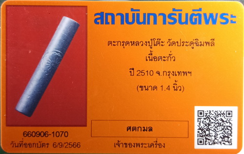 เป็นตะกรุดเนื้อตะกั่วความยาว 3.5 ซม.( คล้องคอได้ ) ตอกโค้ด "ต" ในรัศมี 16 แฉก สามารถพิจารณาได้ง่ายว่าเป็นตะกรุดแท้ เนื่องจากมีการตอกโค้ดกำกับเอาไว้ และมีภาพบันทึกไว้ในหนังสือพระเครื่องของหลวงปู่ทุกเล่ม ซึ่งก็ยิ่งทำให้ง่ายต่อการพิจารณาเป็นอย่างมาก และรับรองว่าเป็นตะกรุดแท้ 100% ***ผู้ที่ศึกษาด้านพระเครื่องมานานๆ จะทราบดีว่า พระเครื่องหรือเครื่องรางที่เป็นเนื้อตะกั่ว เมื่ออาจารย์ผู้ปลุกเสกมีวัตรปฎิบัติอันงดงาม เคร่งครัด ลงพุทธคุณแล้วดีอย่างไร ..........ตะกรุดที่นำลงในชมรม มีผิวปรอทเดิม ตอกโค้ดเต็มชัดเจน ดูง่ายมากๆ เอาไปใส่หลอดแขวนบูชาได้เลย มีให้พร้อมบัตรรับรอง