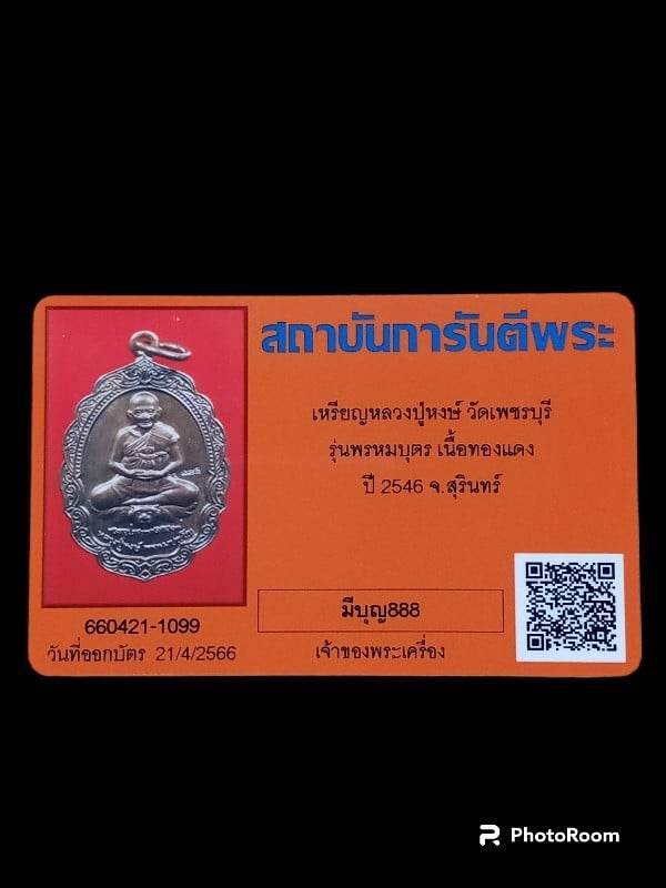 เหรียญพรหมบุตร รุ่น นั่งรวย หลวงปู่หงษ์ พรหมปัญโญ สุสานทุ่งมน(วัดเพชรบุรี) จ.สุรินทร์ ปี 2546 เนื้อทองแดงผิวเดิมๆ หน้าเหรียญตอกโค้ต นะ เม ติ ด้านหลังเป็นยันต์นางจัน เป็นเหรียญอีกรุ่นที่มีความสวยงามมาก เหรียญหลักอันดับต้นๆของหลวงปู่หงษ์ พร้อมบัตรรับรองค่ะ