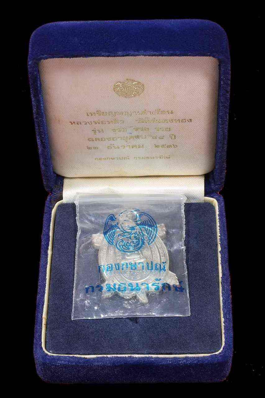 เหรียญพญาเต่าเรือนหลวงปู่หลิว รุ่นรวยรวยรวย เนื้อเงิน สร้างวาระครบรอบหลวงปู่อายุครบ 88 ปี ปี 2536 ผลิตโดยกองกษาปณ์กรมธนารักษ์ เนื้อเงินจำนวนการสร้าง 7,488 เหรียญ เหรียญนี้สภาพสวยเดิมๆไม่ผ่านการใช้ ซองกองกษาปณ์ กล่องนอกกล่องใน เดิมยังอยู่ครบค่ะ