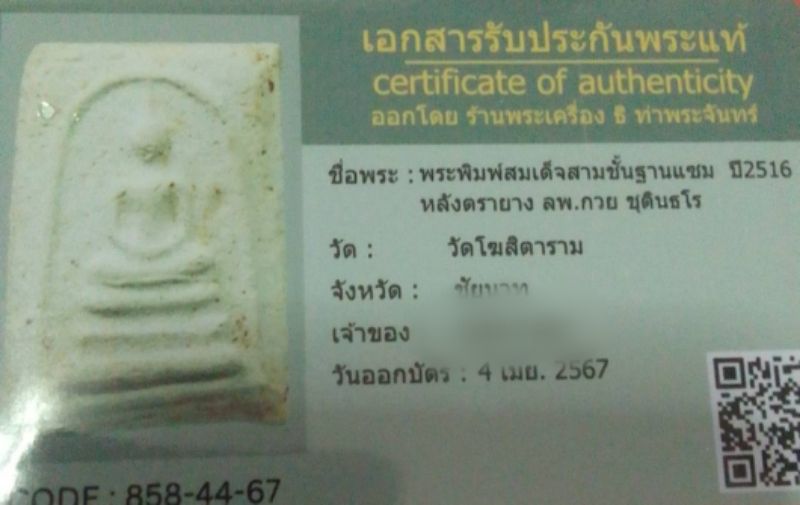 พระสมเด็จขาว หลังปั้มตราวัดปี2521 พิมพ์ฐานแซม หลวงพ่อกวย วัดโฆสิตาราม แบ่งออกเป็น 3 พิมพ์ มีพิมพ์ใหญ่ พิมพ์ฐานแซม และพิมพ์เส้นด้าย จริงๆแล้วพระสมเด็จขาวเป็นพระที่หลวงพ่อท่านสร้างเองมาตั้งแต่ปี 2516 ถึงปี 2518 ไม่ใช่พระโรงงาน และแจกมาเรื่อยๆ มีบางส่วนตกค้างก็นำมาให้เช่าในงานผูกพัทธสีมา 2521 ก็จะมีปั๊มตราวัดอยู่ด้านหลัง เหมือนรูปพรรษาสุดท้ายรูปถ่ายปี 2521 ของพ่อที่จะมีตราวัดปั๊มอยู่ด้านหลัง ยิ่งทำให้เพิ่มความมั่นใจได้ว่าเป็นของวัดหลวงพ่อกวยวัดโฆสิตารามอย่างแน่นอน มีส่วนผสมมวลสารของสมเด็จวัดระฆังโฆสิตารามเก่า เพราะหลวงพ่อท่านได้ทำผงวัดมวลสารตามต้นตำรับตำราของวัดระฆังโฆสิตารามที่หลวงพ่อท่านไปเรียนกับหลวงปู่นาควัดระฆังโฆสิตารามในสมัยนั้น และได้ใส่มวลสารเก่าของวัดระฆังโฆสิตารามลงไปด้วย เรียกได้ว่าใช้แทนสมเด็จบางขุนพรหมที่ราคาเป็นล้านได้เลย เป็นพระที่เล่นหามาอย่างช้านานประสบการณ์มากมาย เป็นพระมาตรฐานสากลมีลงในหนังสือของหลวงพ่อทุกเล่มมีในรายการประกวดของสมาคม องค์นี้สภาพสวยผิวเดิมๆ มาพร้อมบัตร อ.ธิ ท่าพระจันทร์(บัตรถึงแล้วจะลงรูปตามครับ) น่าใช้บูชาครับ รับประกันตามกฎ