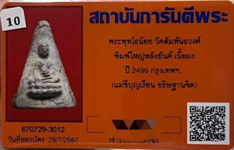 พระพุทธโธน้อย คุณแม่บุญเรือน (บล็อคลองพิมพ์) พิมพ์สามเหลี่ยมหลังยันต์อุทธังอัทโธ เนื้อผง ปี2494 วัดอาวุธวิกสิตาราม กรุงเทพ เป็นพระพุทธโธน้อยยุคแรกๆซึ้งคุณแม่บุญเรือน โตบุญเติม ไดัสร้างและอธิฐานจิตรปลุกเสกเอาไว้ที่วัดอาวุธวิกสิตาราม เมื่อ ปี2494 นิยมเรียกพระพุทธโธน้อยรุ่นนี้ว่า(พระบล็อคลองพิมพ์) (สังเกตุที่พิมพ์พระและลักษณะการกดยันต์ด้านหลัง จะไม่ปราณีตเรียบร้อยเหมือนพระบล็อคปีที่สร้างหลังจากนี้) ลักษณะเป็นพระเนื้อผงน้ำมัน มีทั้งพิมพ์สี่เหลี่ยมและพิมพ์สามเหลี่ยม ด้านหลังพระเป็นยันต์อุททังอัทโธ เหมือนกันทั้งสองพิมพ์ จำนวนการสร้างรวมกันทั้งสองพิมพ์ไม่หน้าจะเกิน 500 องค์ จัดเป็นพระที่หาชมยากเนื่องจากมีจำนวนการสร้างที่น้อยมากนั้นเอง บางสำนักบางท่าน ระบุเป็นพระพุทโธหลังยันต์พิเศษที่ออกวัดสารนารถปี2499 ถึงจะเป็นพระปีไหนก็ยังเป็นพระแท้ทันคุณแม่เช่นกันครับ องค์นี้สวยเดิมๆมาพร้อมบัตร รับประกันตามกฎครับ