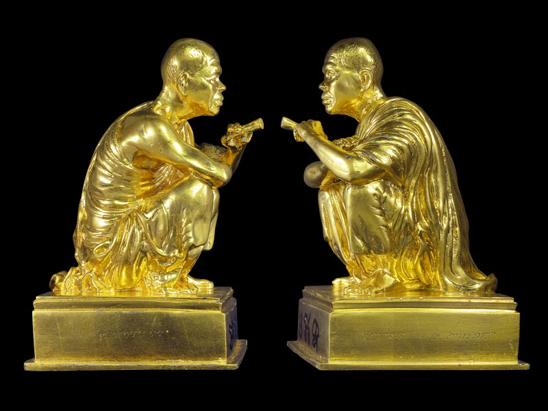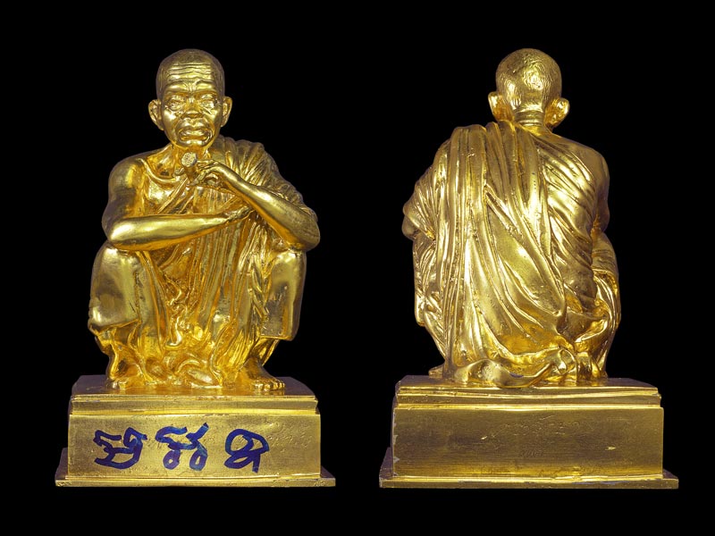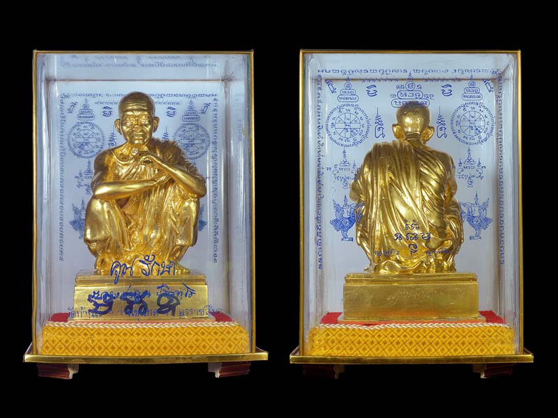 พระบูชารูปเหมือนนั่งยอง ( 5 นิ้ว ) รุ่น อายุ 73 ปี คูณรักษา ( เนื้อโลหะลงรักปิดทอง กรรมการ ) พ.ศ.2538 ( ตู้กระจกสกรีนยันต์ ) จารหมึกลายมือหลวงพ่อคูณ ยันต์อักขระตัว มะอะอุ