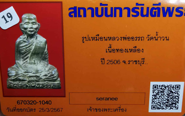 | รูปเหมือนหลวงพ่ออรรถ วัดน้ำวน เนื้อทองเหลือง ปี2506 จ.ปทุมธานี |