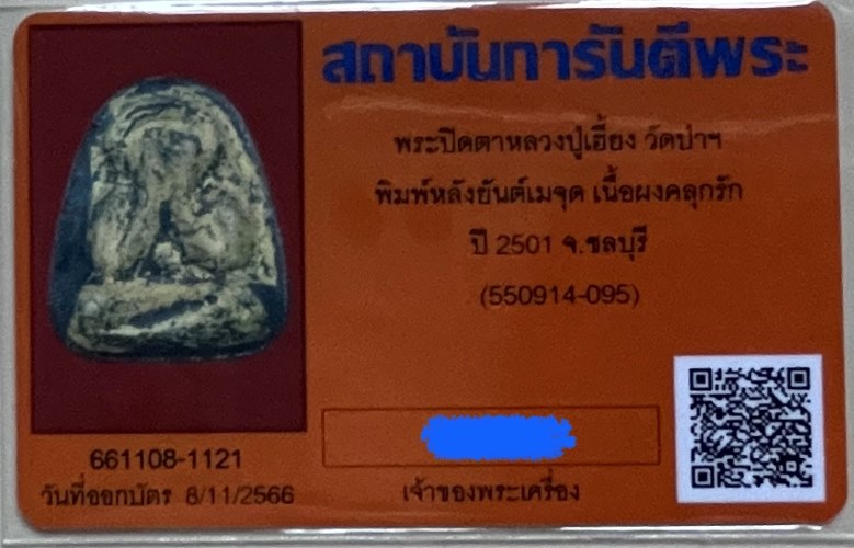 | พระปิดตาหลวงปู่เฮี้ยง วัดป่า เนื้อผงคลุกรัก หลังยันต์เมตจุด ปี 2501 จ.ชลบุรี พร้อมบัตรรับรองครับ |