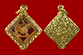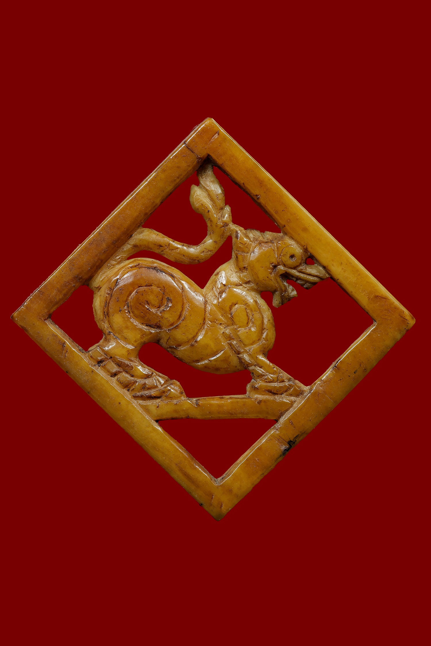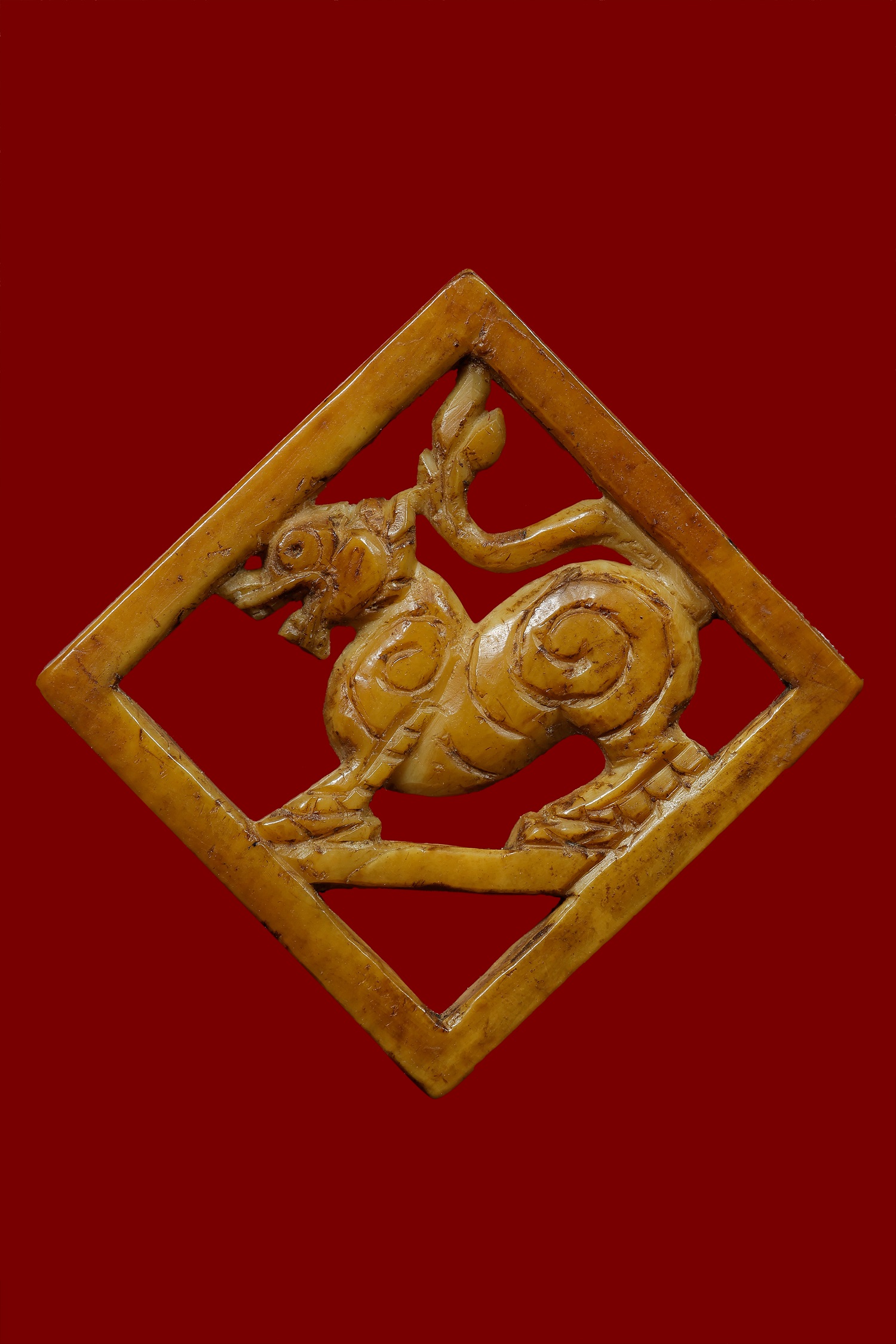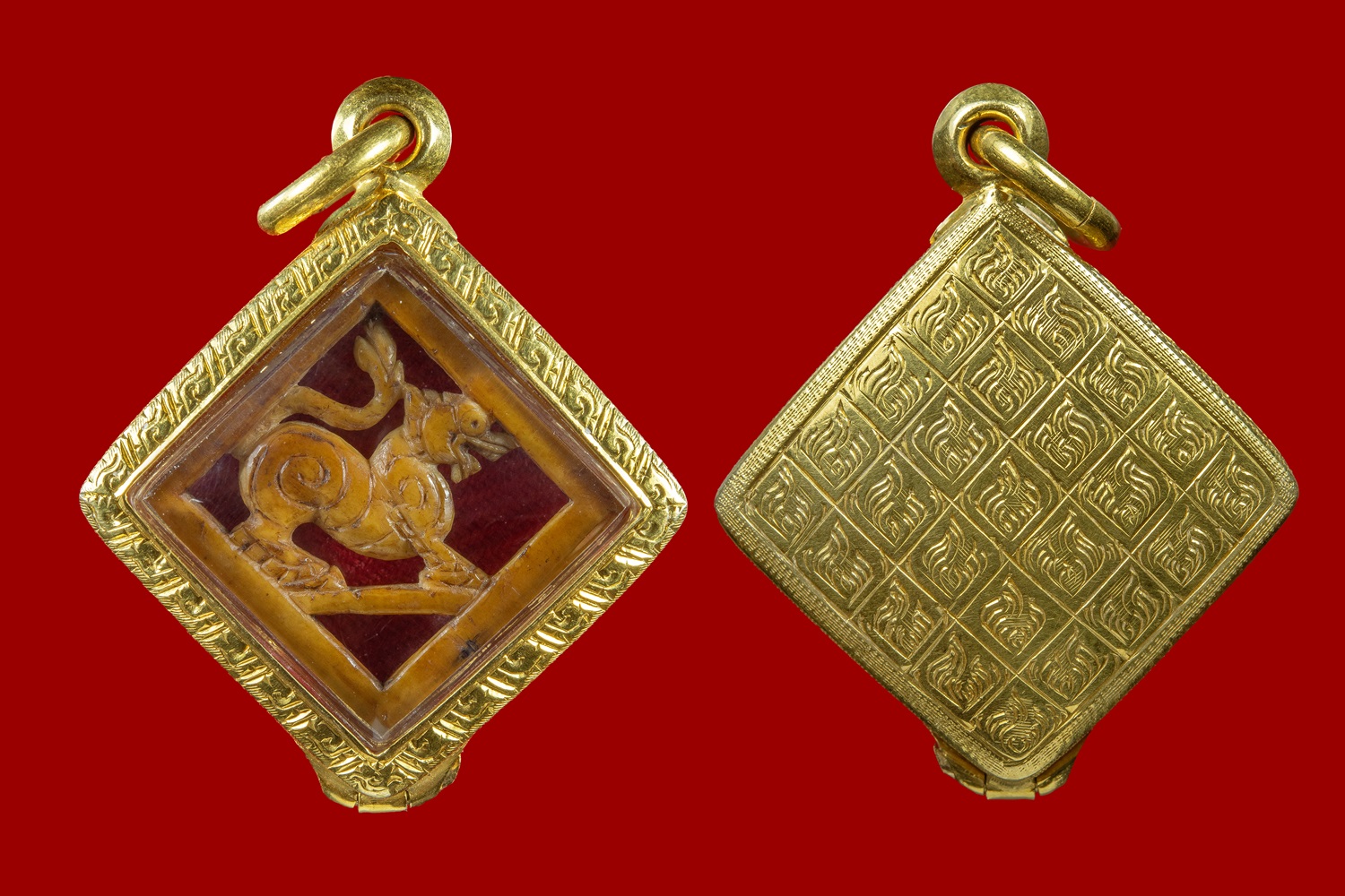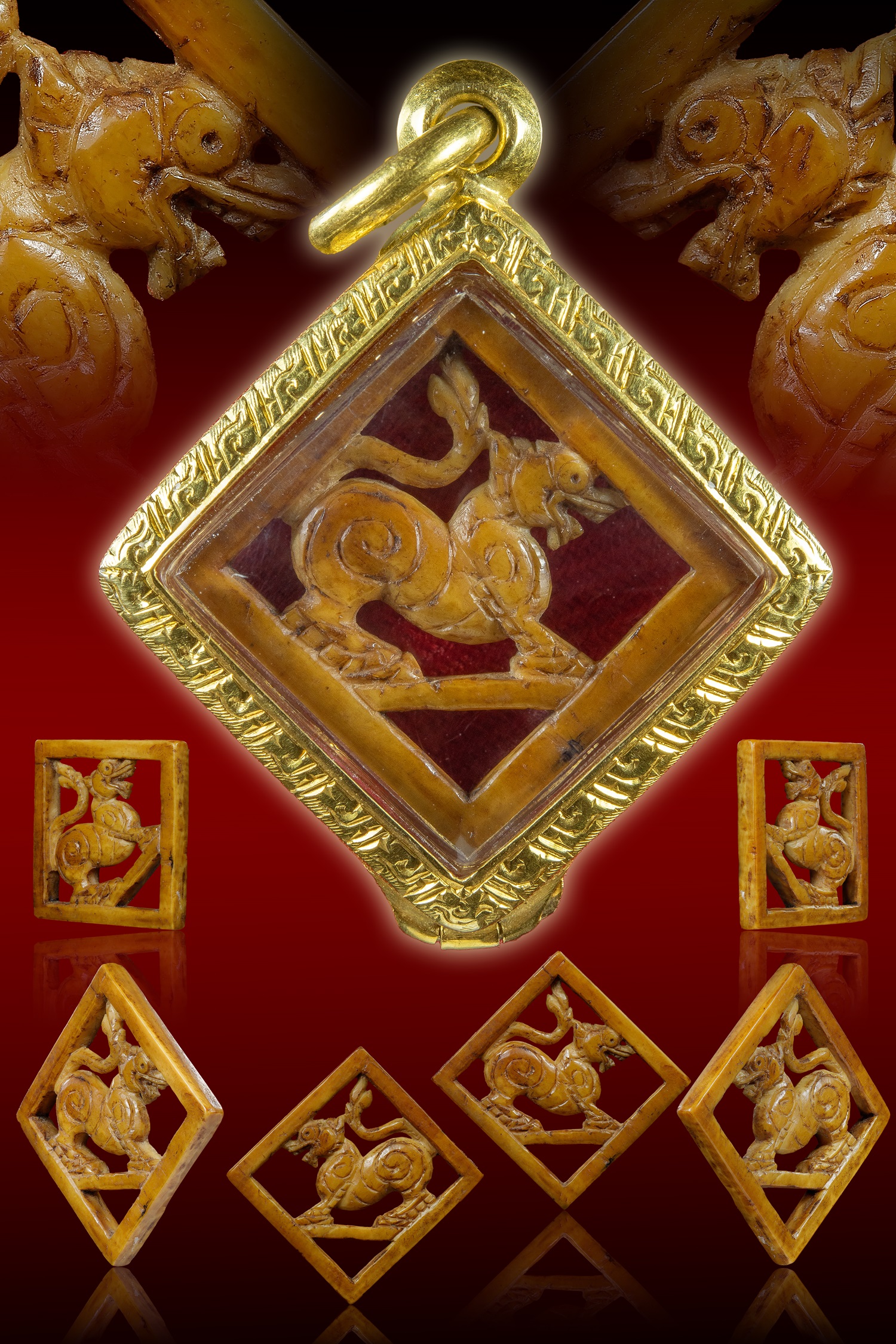 สิงห์งาแกะ สองขวัญ หลวงพ่อเดิม วัดหนองโพ ศิลป์กรอบฉลุข้าวหลามตัด ขนาดความกว้างและสูงประมาณ 1.6 * 1.6 เซ็นติเมตร สภาพสวย สมบูรณ์ งาออกสีน้ำผึ้ง หายาก เลี่ยมตลับทองหนาหนาพร้อมใช้ครับ