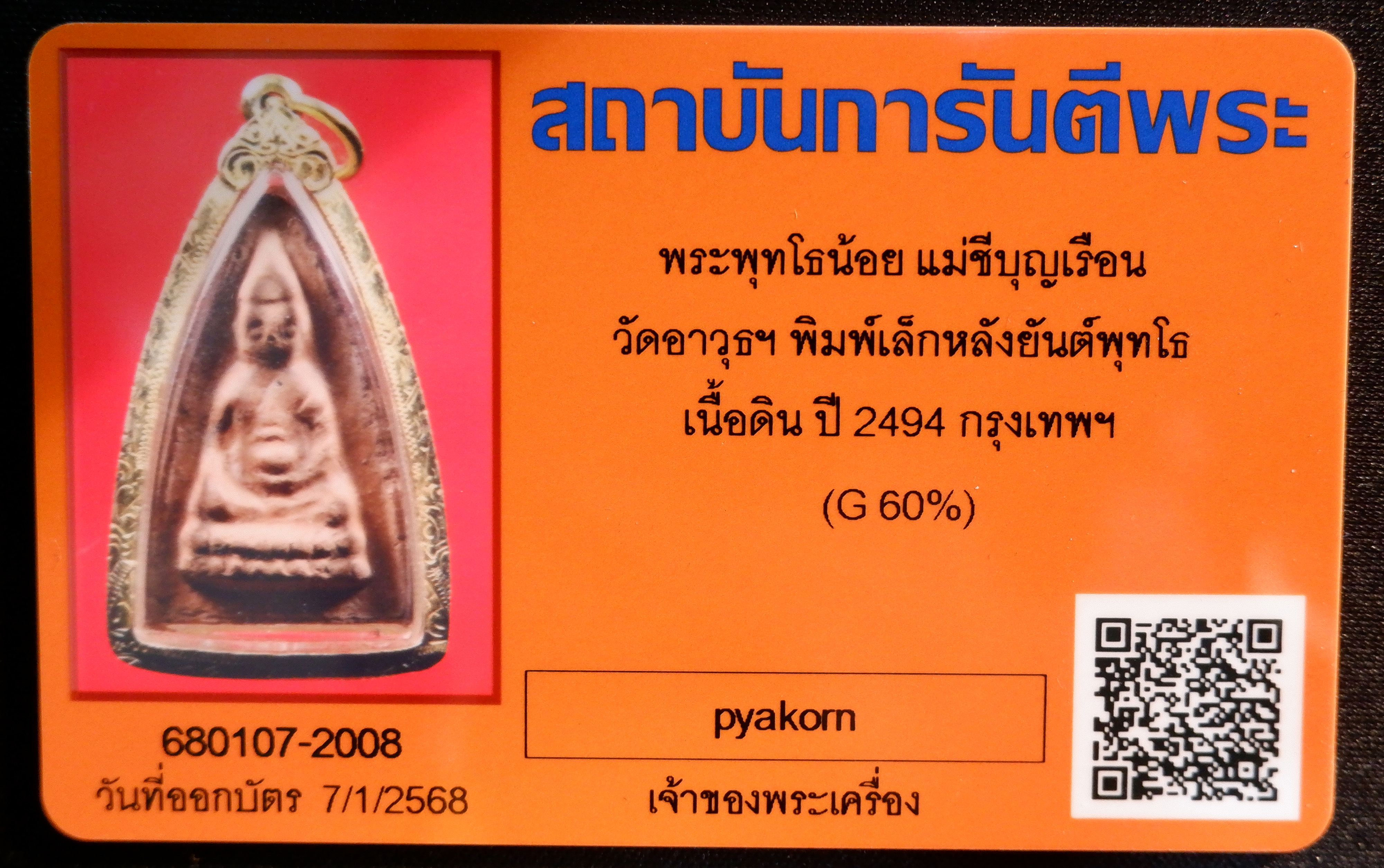 พระพุทโธน้อย หลังยันต์พุทโธ แม่ชีบุญเรือน วัดอาวุธ พิมพ์เล็ก ปี 2494 สภาพสวยหน้าเด้ง หลังยันต์จม คมชัดลึกทั้งหน้าและหลัง แบบนี้ไม่ใช่จะหาง่ายๆครับ เลี่ยมทองพร้อมใช้ มาพร้อมบัตรรับรอง รับประกันพระแท้ๆ แบบสากลตลอดชีพ และตามกฎครับ