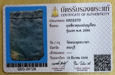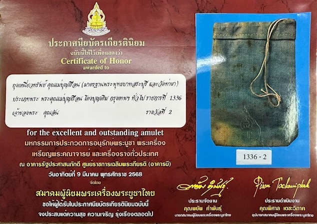 ถุงเขียวเหนียวทรัพย์ คุณแม่บุญเรือน โตงบุญเติม ถุงเหนี่ยวทรัพย์ของคุณแม่บุญเรือนมีหลายสี เช่น สีเขียว ขาว น้ำเงิน เหลือง ชมพู แดง ดำ มีหลายแบบหลายลักษณะทั้งผ้าละเอียด ผ้าหยาบ ใบเล็ก ใบใหญ่ แบบขลิบขาวขอบ แบบผ้าพื้น แบบสอยสอยตะเข็บปากถุงด้วยมือ ถุงแบบรวมหลายสีก็มี คุณแม่ได้อธิษฐานถุงเขียวเหนี่ยวทรัพย์ จากนั้นจึงได้แจกแก่บรรดาสานุศิษย์เมื่อปี 2496 ถุงเขียวใบนี้สภาพสมบูรณ์ ไม่ขาดไม่แหว่ง สีซีดตามอายุุ ที่สำคัญติดที่2 งานประกวดใหญ่ของสมาคมฯที่ศูนย์ราชการ ของป๋าพยัพ คำพันธุ์ การันตีความแท้และความสวยเดิมครับ