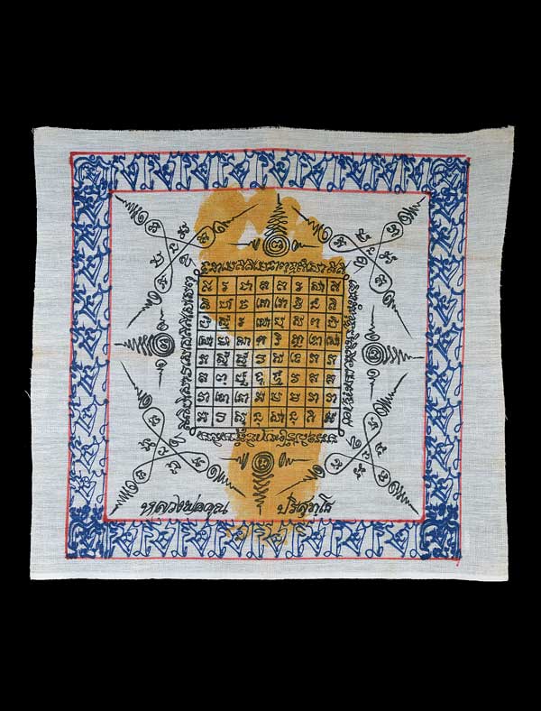 | ผ้ายันต์จารลายมือ ประทับขมิ้นรอยฝ่าเท้าขวา หลวงพ่อคูณ ปริสุทฺโธ วัดบ้านไร่ พ.ศ.2530 / เขียนสดด้วยหมึก 3 สี ( ดำ,แดง,น้ำเงิน ) จารลายมือทั้งผืน , ขนาดผ้า 12.5 x 12 นิ้ว / หลวงพ่อคูณ ปริสุทฺโธ ปลุกเสก / หลวงพ่อทอง สุทฺธสีโล ( ศิษย์เอกหลวงพ่อคูณ ) ลงยันต์อักขระ |
