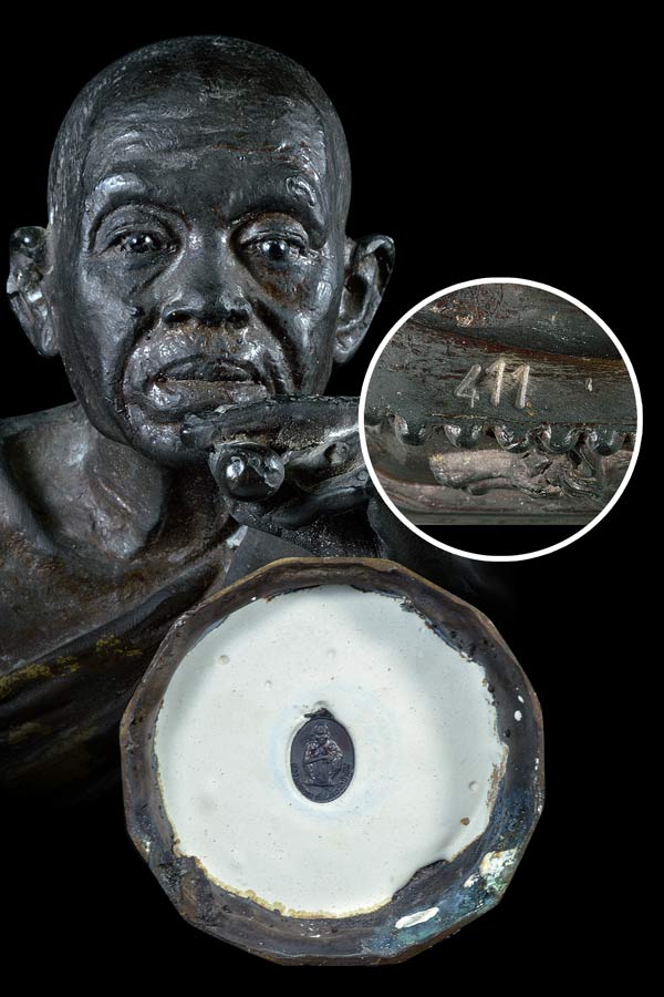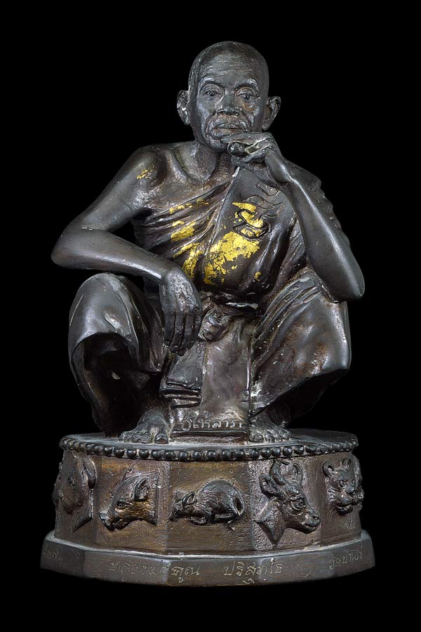 พระบูชารูปเหมือนนั่งยองฐาน 12 ราศี ขนาด 5 นิ้ว หลวงพ่อคูณ ปริสุทฺโธ วัดบ้านไร่ รุ่น กูให้ลาภ / เพื่อสนับสนุนการก่อสร้างศาลาการเปรียญและถังเก็บน้ำฝน วัดบ้านบุ อ.จักราช จ.นครราชสีมา พิธีพุทธาภิเษก วันที่ 24 มิถุนายน พ.ศ.2537 ( วันชาติ ) / ดวงตาหลวงพ่อฝังนิลดำ ใต้ฐานฝังเหรียญรูปเหมือนนั่งยอง รุ่นกูให้ลาภ ปั๊มตราวัดบ้านบุ ( จัดสร้าง 500 องค์ ) หมายเลข 411