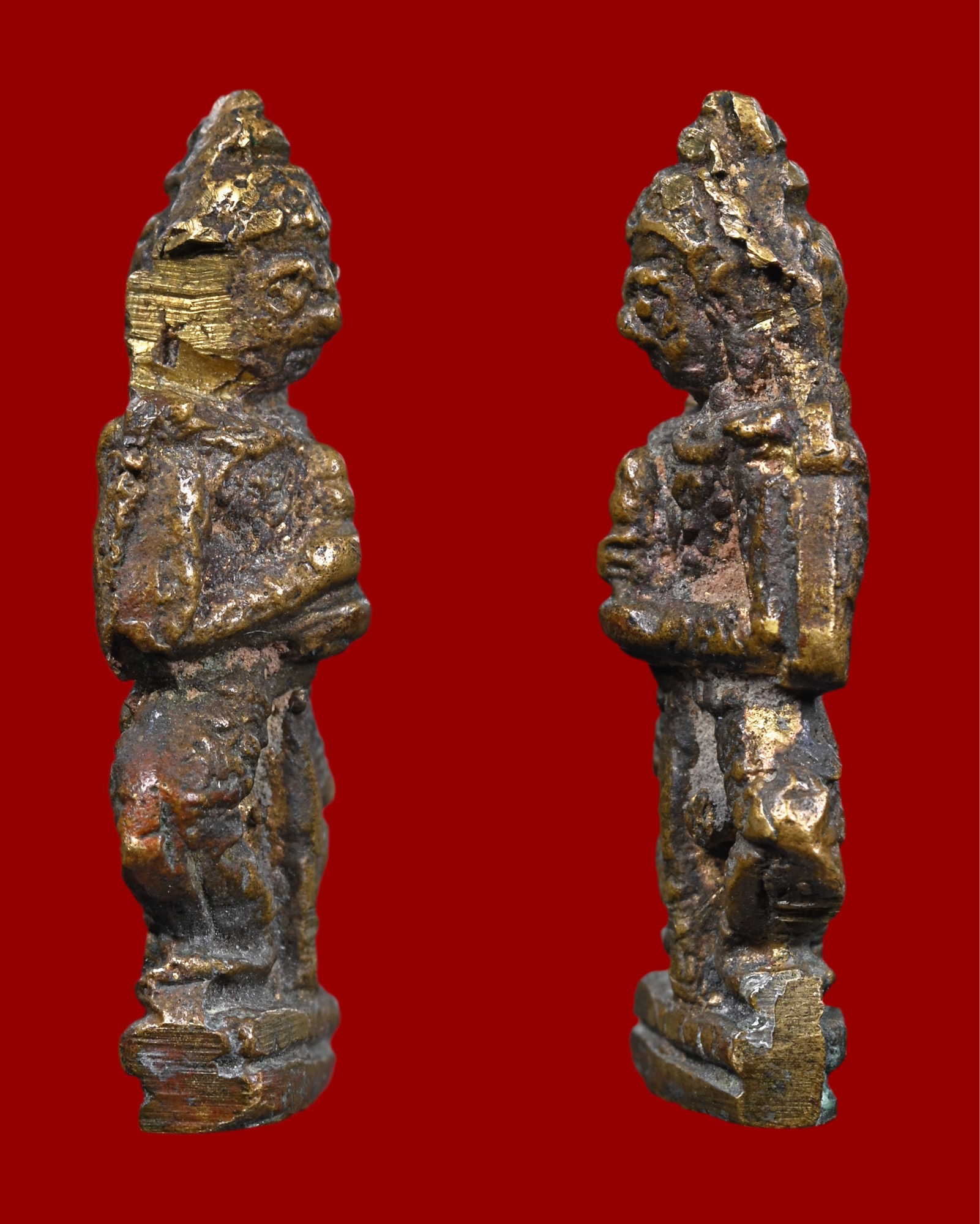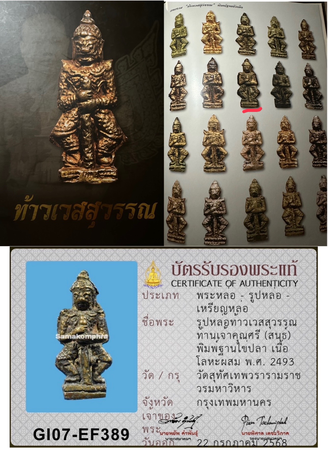 รายละเอียด ท้าวเวสสุวรรณ เจ้าคุณศรี (สนธิ์) พิมพ์ฐานไข่ปลา วัดสุทัศน์ องค์นี้สวยคมหน้าตาคมชัด ดินเบ้าเต็มองค์ องค์ดาราหนังสือเแถมบัตรสมาคม 👍 สวยงามหายากของแท้ สร้างไม่เกิน500องค์ครับ 🙏 ท้าวกุเวรนอกจากนี้ในตำราโบราณและงานวรรณคดีกล่าวตรงกันว่า "ท้าวเวสสุวรรณ" เป็นยักษ์ที่มีพัสตราภรณ์และ ผิวกายสีเหลืองทอง จิตใจดีงาม ดำรงอยู่ในสัตยธรรม ถึงขนาดอุทิศตนถวายพิทักษ์รักษาพุทธสถาน และองค์พระพุทธเจ้าเช่น รูปหล่อปิดทองด้านซ้ายของฐานองค์พระพุทธชินราช วัดพระศรีรัตนมหาธาตุ จังหวัดพิษณุโลก ก็ทำเป็นรูป "ท้าวเวสสุวรรณ" ส่วนด้านขวาเป็นยักษ์อีกตนหนึ่งซื่อ "อาพาวกยักษ์" เหตุที่เรียกกันว่า "ท้าวกุเวร" เนื่องจากพระพรหมเห็นว่ามีรูปร่างไม่ดี ร่างกายพิการ ต้องถือไม้เท้า จึงตั้งชื่อให้ดังนั้น ที่บ้านเรามาจำหลักเป็นยักษ์ถือตะบองยันพื้น ก็คงจะมีเค้าเงื่อนมาจากเรื่องดังกล่าว ความหมายของชื่อ "ท้าวเวสสุวรรณ" นั้น เวส แปลว่า พ่อค้า หมายถึง พ่อค้าอันมีทรัพย์ อันได้แก่ ทองคำ เนื่องจาก "ท้าวเวสสุวรรณ" เคยมีอดีตชาติเป็นพราหมณ์ เปิดโรงงานค้าขายหีบอ้อยจนร่ำรวย และได้นำเงินทองบริจาคให้ผู้ยากไร้เมื่อเกิดใหม่จึงได้ครองเมืองวิสานะนคร ผู้คนจึงเรียกว่าเวสาวัณ ด้วยกุศลดังกล่าวจึงได้รับพรจากพระพรหมให้เป็นอมตะไม่ตาย และให้เป็นเจ้าของทรัพย์สมบัติต่างๆ ทั่วแผ่นดิน บ้านเรารู้จักกันในชื่อ "ปู่โสมเฝ้าทรัพย์" หรือในชื่อ "ธนบดี" แปลว่า ผู้เป็นใหญ่ในทรัพย์ หรือ "ธเนตวร" แปลว่าเจ้าแห่งทรัพย์ อีกทั้งมีหน้าที่คอยจดความดีของคนทางทิศอุดรขึ้นไปจารึกและประกาศให้ปวง เทพยดาบนสวรรค์ชั้นดาวดึงส์รับรู้ จึงนิยมจัดสร้าง หรือจำหลักรูป "ท้าวเวสสุวรรณ" ขึ้นไว้เคารหบูชาเพื่อความมั่งคั่งอีกด้วยโดยมีทั้งคาถาและผ้ายันด์ ส่วน้ารบคที่มีนมากที่สุดซึ่งได้จัดสร้างขึ้นมาเป็นรูป "ห้าวเวสุวรรณ" ก็คือรูปหล่อเนื้อโลหะผสมของท่านเจ้าคุณ🙏