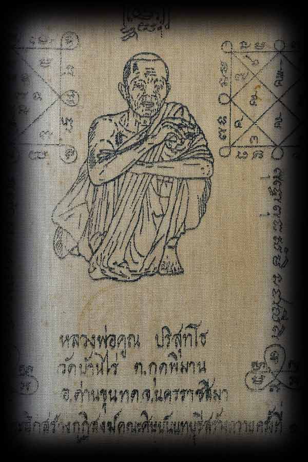 ผ้ายันต์ ( ผ้าครู ) หลวงพ่อคูณ ปริสุทโธ วัดบ้านไร่ ที่ระลึกสร้างกุฏิสงส์ คณะศิษย์นนทบุรี สร้างถวาย พ.ศ.2529 / ปั๊มตราวัดบ้านไร่ , 8.5 X 10.5 นิ้ว / ผ้าครู : หลวงพ่อคูณ ได้ให้ผ้าครู ผ้าดิบสีขาว ที่ท่านไว้ใช้ในพิธีสำคัญต่างๆ เช่น พิธีปลุกเสกตะกรุดเสาร์ 5 และ เครื่องรางต่างๆ รวมถึงใช้ในพิธีต่างๆ จัดสร้างพร้อมเหรียญผ้าป่านนทบุรี พ.ศ.2529 แถวที่ 1 บน : นะ มะ พะ ทะ มะ พะ ทะ นะ แถวที่ 2 บน : พะ ทะ นะ มะ ทะ นะ มะ พะ แถวข้างขวามือหลวงพ่อ : นะ โม พุท ธา ยะ มะ อะ อุ แถวข้างซ้ายมือหลวงพ่อ : ยะ ธา พุท โม นะ พุท โธ อุ อะ มะ / ผู้จัดสร้าง : คุณ ไกรวิทย์ นวสถาพร และ คณะศิษย์นนทบุรี / วัตถุประสงค์ : เพื่อสมทบทุนสร้างกุฏิสงส์และนำคณะผ้าป่ามาทอดที่ วัดบ้านไร่ จากคณะศิษย์นนทบุรี / ปลุกเสก : 2 ไตรมาส / รายการ 1.ผ้ายันต์ 200 ผืน , 2.กระดาษยันต์ 200 แผ่น