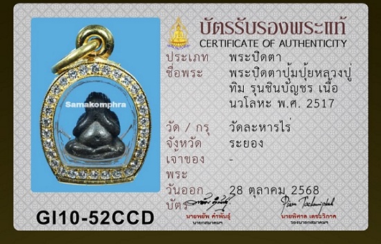 พระปิดตา มหาลาภชินบัญชร หรือ พระปิดตา ปุ้มปุ้ยชินบัญชร 1ใน4 ชุดชินบัญชร ของหลวงปู่ทิม วัดละหารไร่ สร้างจำนวน 1600 องค์ เป็นเนื้อนวะโลหะทั้งหมด ตอกโค๊ต \"นะ\" ไว้ที่ใต้ฐานทุกองค์\r\nพระองค์นี้ผิวเดิมๆสวยๆครับ นิ้วมือติดชัดทุกนิ้ว องค์พระสมบูรณ์ ผิวดีๆรอยตะไบหาไม่เจอเลย พร้อมตลับเพชรแท้งามๆ