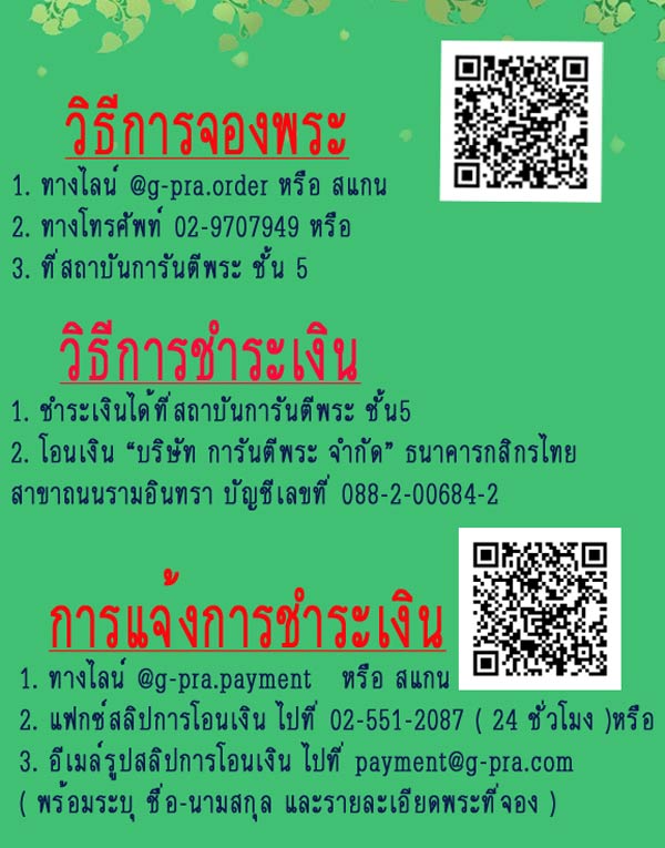 1. โอนเงินเข้าบัญชีออมทรัพย์ "บริษัท การันตีพระ จำกัด" ธนาคารกสิกรไทย สาขาถนนรามอินทรา บัญชีเลขที่ 088-2-00684-2 หรือ