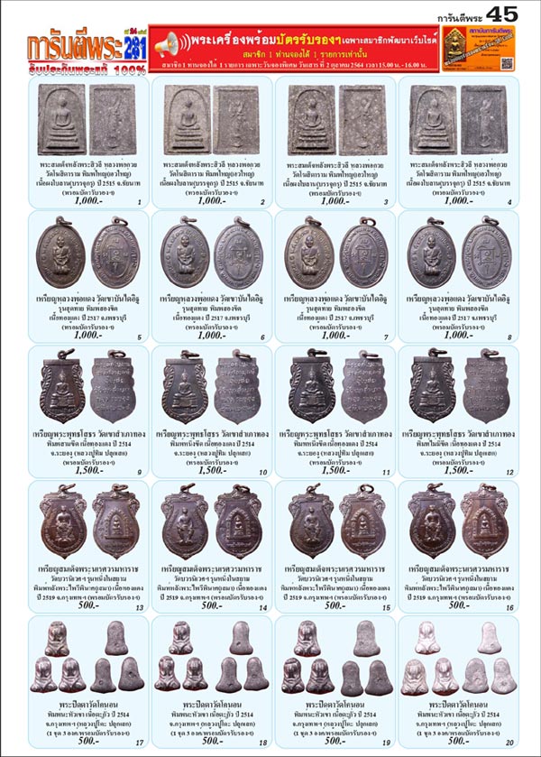 - เปิดเช่าพระเครื่องในราคา ** ถูกพิเศษ** ในหน้าพิเศษนี้ จำนวน 20 องค์ พร้อม ** บัตรรับรองพระเครื่องทุกองค์ ** ในวันเสาร์ที่ 2 ตุลาคม 64 เวลา 15.00-16.00 น. ที่เบอร์โทร 085-526-8682 และ 085-992-6303 เท่านั้น