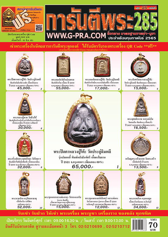 *** ในหน้า 2 ฉบับที่ 285 ประจำเดือนกุมภาพันธ์ 2565 สมาชิกนิตยสารการันตีพระ และสมาชิกพัฒนาเว็บไซต์ฯ สามารถโทรจองได้ในวัน *** เสาร์ที่ 5 กุมภาพันธ์ 2565 เวลา 14.00-16.00 น. ***