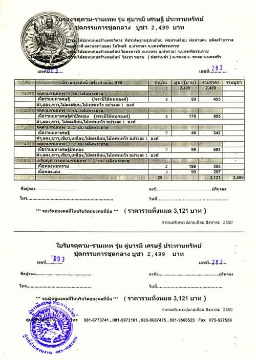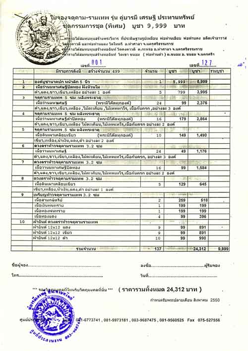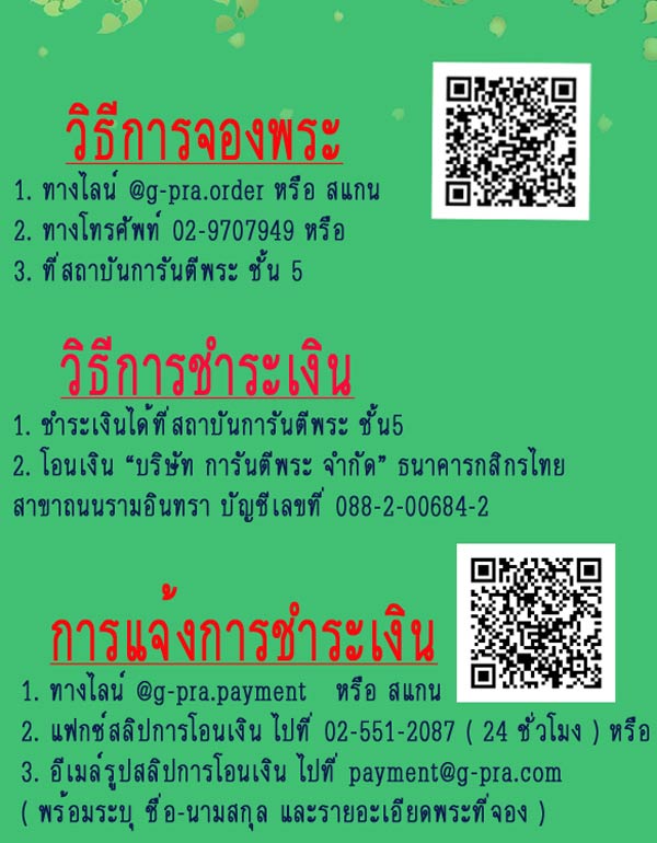 ท่านที่ประสงค์ให้จัดส่งใบจอง และพระทางไปรษณีย์ กรุณาเพิ่มค่าจัดส่งครั้งละ 50 บาท