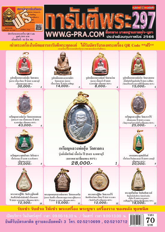 *** ในหน้า 2 ฉบับที่ 297 ประจำเดือนกุมภาพันธ์ 2566 สมาชิกนิตยสารการันตีพระ และสมาชิกพัฒนาเว็บไซต์ฯ สามารถโทรจองได้ในวัน *** เสาร์ที่ 4 กุมภาพันธ์ 2566 เวลา 14.00-16.00 น. ***