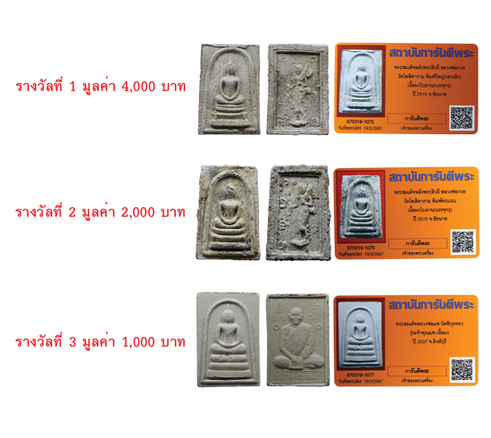 - เพื่อแทนคำขอบคุณนี้ ทางเว็บไซต์ฯ ขอมอบพระเครื่องพร้อมบัตรรับรอง QR Code จำนวน 3 รางวัล ประจำเดือนเดือนเมษายน 2567 นี้ให้กับท่านสมาชิกฯ โดยทางเว็บไซต์ฯจะจับสลากจากรายชื่อท่านสมาชิกพัฒนาเว็บไซต์ฯทุกท่าน ในวันเสาร์ที่ 6 เมษายน 2567 เวลา 16.00 น. และจะประกาศรายชื่อผู้ได้รับรางวัล ที่หน้าเว็บไซต์ฯในวันจันทร์ที่ 8 เมษายน 2567 โดยท่านสมาชิกสามารถรับรางวัลได้ที่สถาบันการันตีพระ ชั้น 5 หรือ แจ้งให้จัดส่งทางไปรษณีย์ได้ทางไลน์แอดที่ @g-pra.payment (24 ชั่วโมง) หรือโทรแจ้งที่เบอร์โทร 02-521-0699 , 02-521-0712 ( ค่าจัดส่ง 100 บาท )