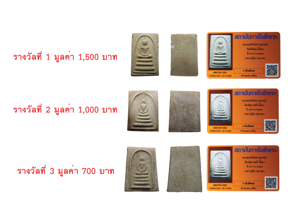 - เพื่อแทนคำขอบคุณนี้ ทางเว็บไซต์ฯ ขอมอบพระเครื่องพร้อมบัตรรับรอง QR Code จำนวน 3 รางวัล ประจำเดือนสิงหาคม 2568 นี้ให้กับท่านสมาชิกฯ โดยทางเว็บไซต์ฯจะจับสลากจากรายชื่อท่านสมาชิกนิตยสารการันตีพระออนไลน์และสมาชิกพัฒนาเว็บไซต์ฯทุกท่าน ในวันเสาร์ที่ 2 สิงหาคม 2568 เวลา 16.00 น. และจะประกาศรายชื่อผู้ได้รับรางวัล ที่หน้าเว็บไซต์ฯในวันจันทร์ที่ 4 สิงหาคม 2568 โดยท่านสมาชิกสามารถรับรางวัลได้ที่สถาบันการันตีพระ ชั้น 1 หรือ แจ้งให้จัดส่งทางไปรษณีย์ได้ทางไลน์แอดที่ @g-pra.payment (24 ชั่วโมง) หรือโทรแจ้งที่เบอร์โทร 02-521-0699 , 02-521-0712 ( ค่าจัดส่ง 150 บาท )