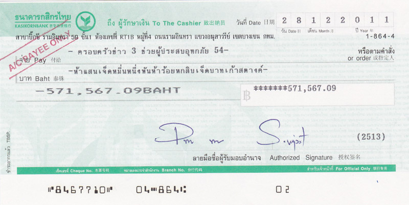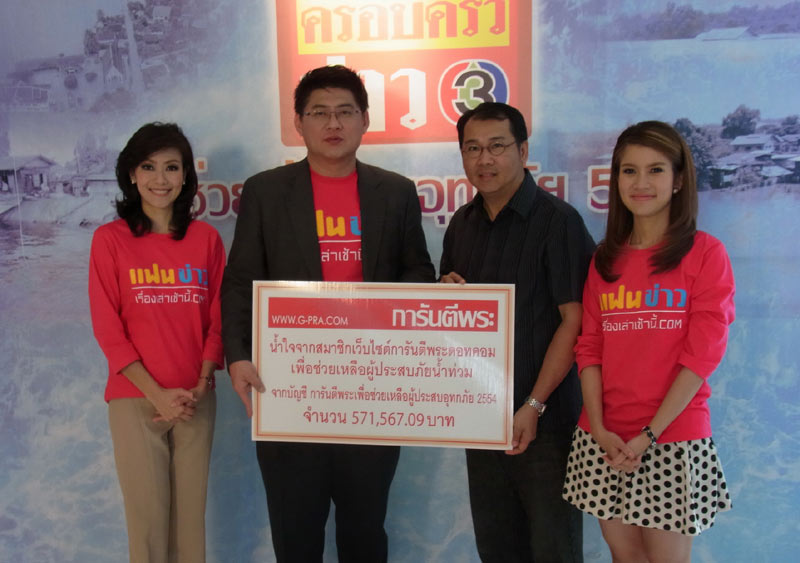 - ทางสถาบันการันตีพระ โดยคุณภินันท์ อัศวสัมฤทธิ์ ผู้อำนวยการสถาบันการันตีพระและกรรมการผู้จัดการบริษัท การันตีพระ จำกัด ได้ดำเนินการส่งมอบเงินร่วมบริจาคนี้ไปยังครอบครัวข่าว 3 ช่วยผู้ประสบภัย 54 โดยคุณสรยุทธ สุทัศนะจินดา และทีมข่าวเป็นผู้รับมอบเมื่อวันที่ 30 ธ.ค.54