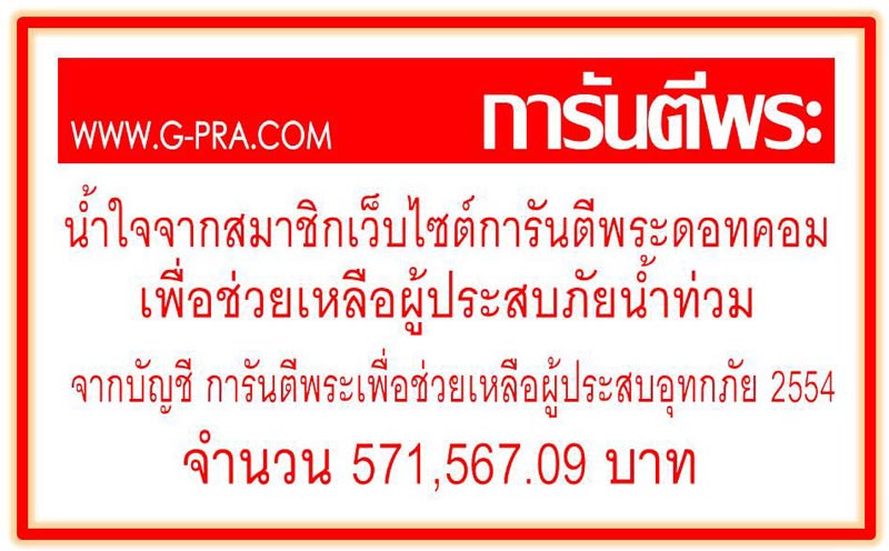 - ทางเว็บไซต์์การันตีพระขอขอบพระคุณท่านสมาชิกทุกท่านที่ได้ร่วมตั้งประมูลและร่วมประมูลบริจาคเพื่อช่วยเหลือชาวไทยผู้ประสบอุทกภัยในปี 2554 นี้ และโดยเฉพาะท่านสมาชิกบ้านพระระยองได้ร่วมตั้งประมูลโดยไม่หักค่าใช้จ่ายของเหรียญเสมาฉลุยกองค์หลวงปู่ทวด ๘ รอบ พ่อท่านพรหม วัดพลานุภาพ จำนวน 13 เหรียญตามกระทู้นี้ https://www.g-pra.com/webboard/show.php?Category=general_talk&No=293554 ได้เงินร่วมบริจาค 431,129 บาท สรุปได้ยอดร่วมบริจาคทั้งหมดทั้งสิ้น 571,567.09 บาทค่ะ