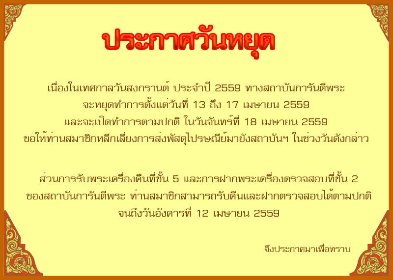 ประกาศวันหยุด เทศกาลสงกรานต์ประจำปี 2559