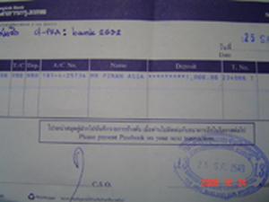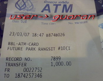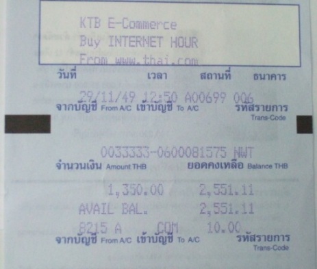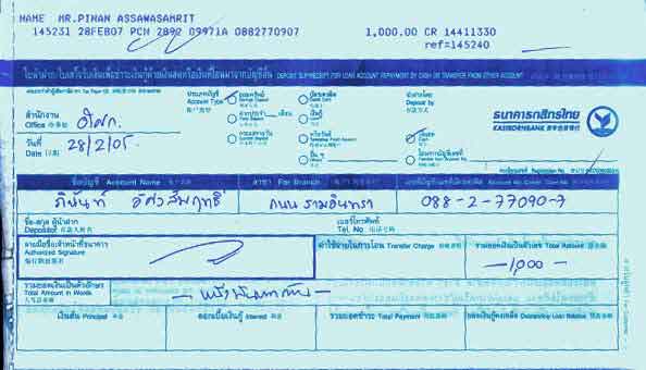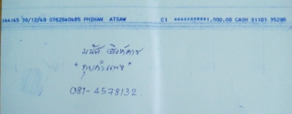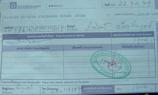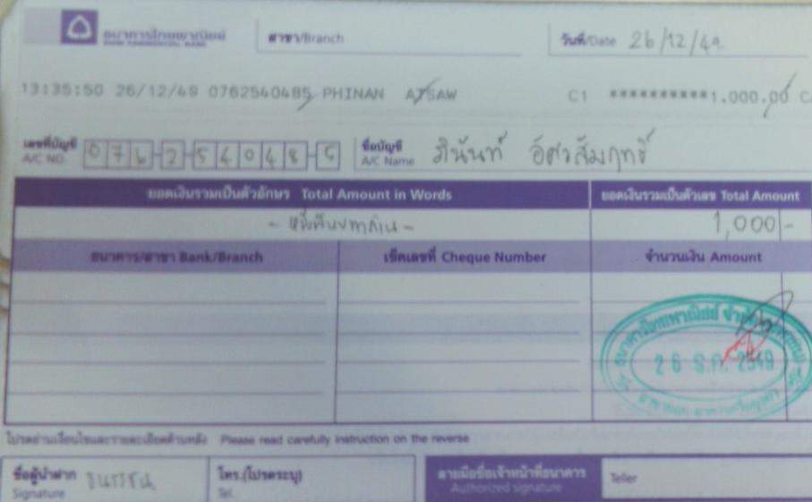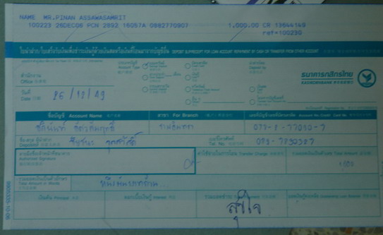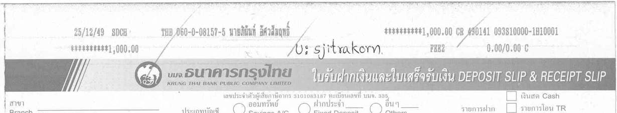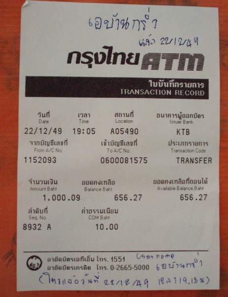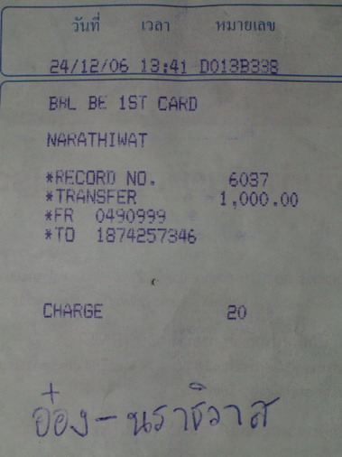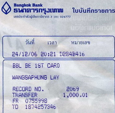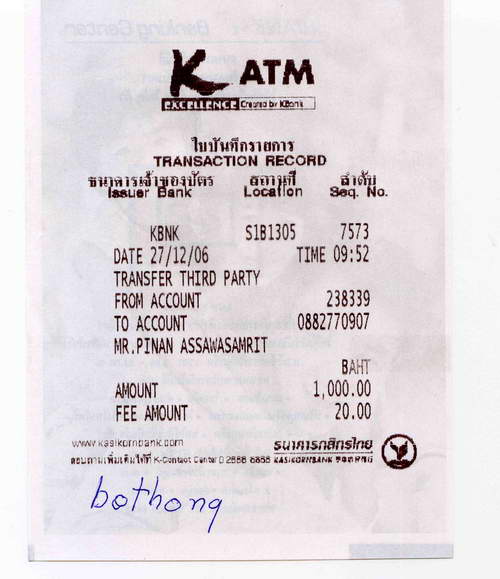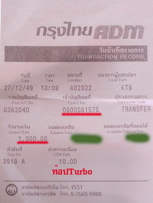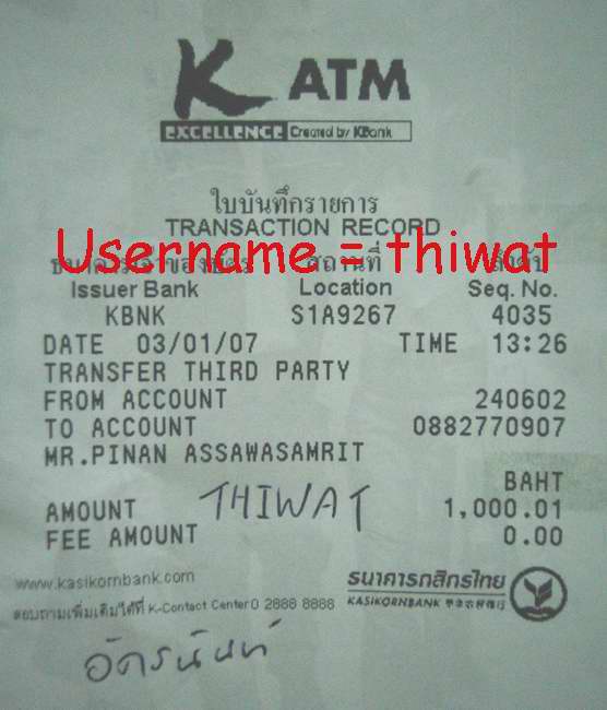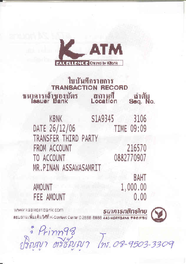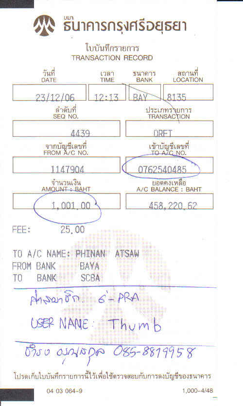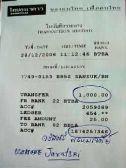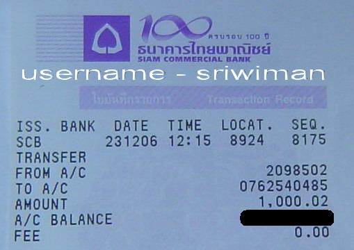 ได้โอนเงินแล้ว ยอดเงิน 1,000.09 บาท ทางธนาคารไทยพาณิชย์ วันที่ 10 มกราคม 2550 แล้วครับ ขอบคุณครับ ดิเรกเมืองเก่า 081 - 4478913