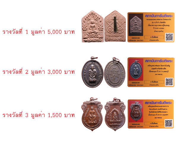 - เพื่อแทนคำขอบคุณนี้ ทางเว็บไซต์ฯ ขอมอบพระเครื่องพร้อมบัตรรับรอง QR Code จำนวน 3 รางวัลประจำเดือน มิ.ย 63 นี้ให้กับท่านสมาชิกฯ โดยทางเว็บไซต์ฯจะจับสลากจากรายชื่อท่านสมาชิกพัฒนาเว็บไซต์ฯทุกท่าน ในวันเสาร์ที่ 6 มิถุนายน 63 เวลา 16.00 น. และ จะประกาศรายชื่อผู้ได้รับรางวัล ที่หน้าเว็บไซต์ฯในวันอาทิตย์ที่ 7 มิถุนายน 63 โดยท่านสมาชิกสามารถรับรางวัลได้ที่สถาบันการันตีพระ ชั้น 5 หรือ แจ้งให้จัดส่งทางไปรษณีย์ได้ทางไลน์แอดที่ @g-pra.payment (24 ชั่วโมง ) หรือโทรแจ้งที่เบอร์โทร 02-551-2086 ( ค่าจัดส่ง 100 บาท )