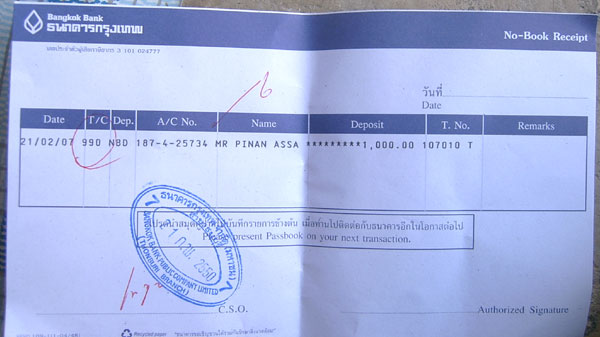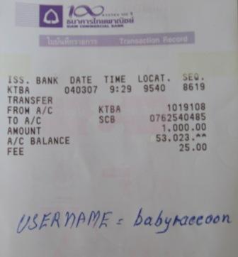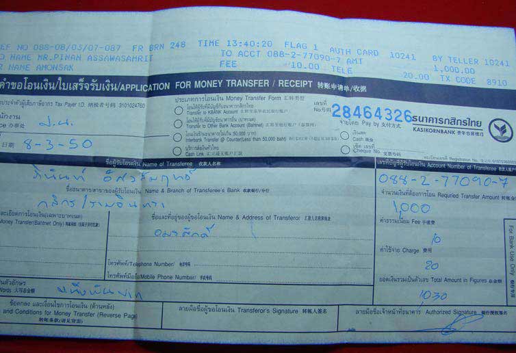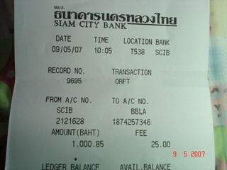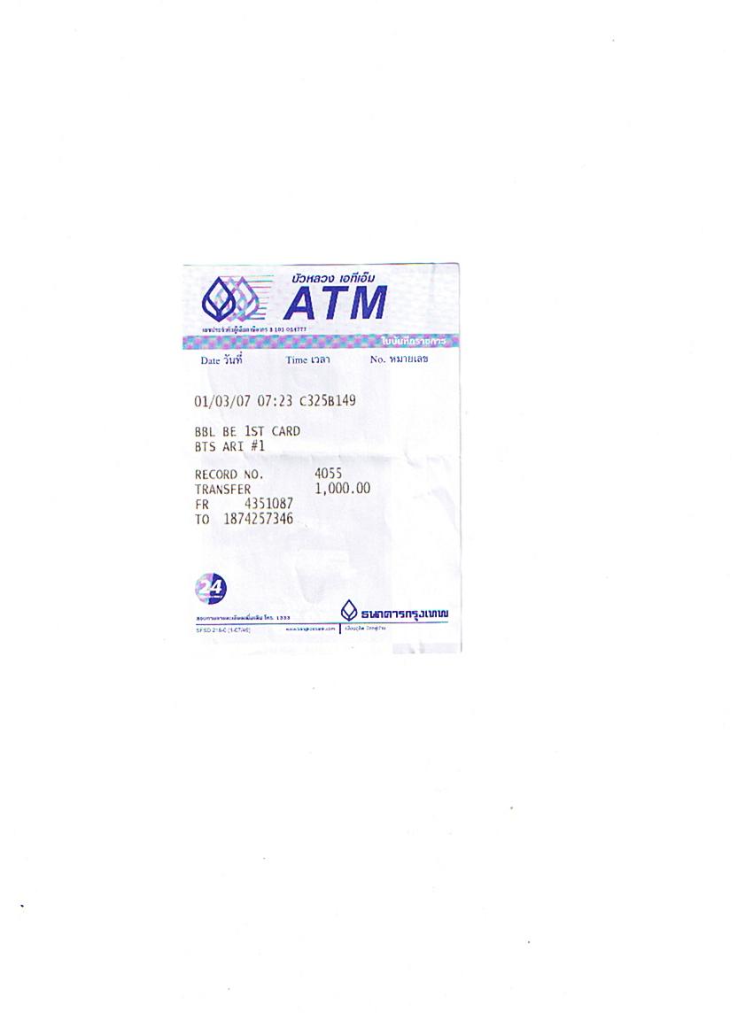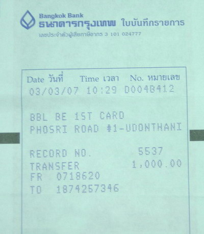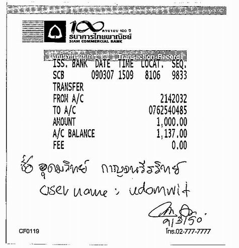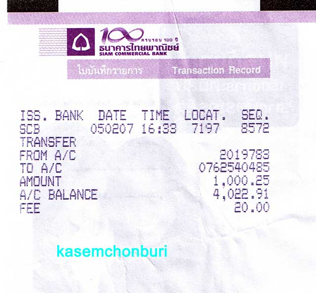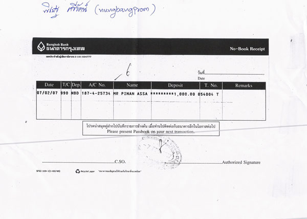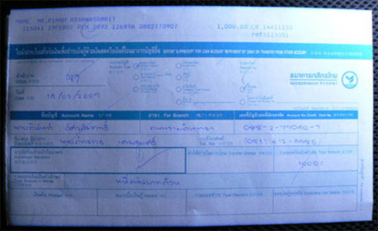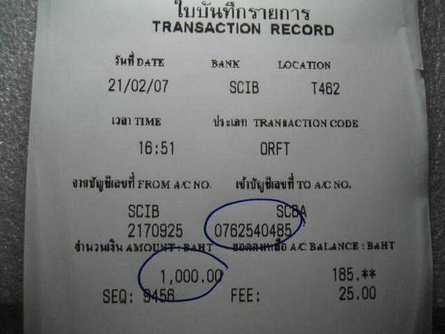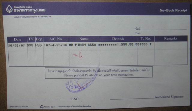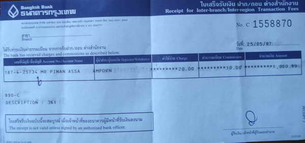 โอนเงินค่าธรรมเนียมเข้าธนาคารกรุงเทพฯ 1,000.09 บาท และได้ Fax สำเนาไปให้แล้วครับ