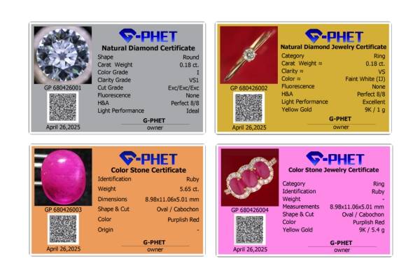 - บัตรรับรองอัญมณีและเครื่องประดับ เป็นผลจากทัศนะจากที่ปรึกษาผู้เชี่ยวชาญด้านอัญมณีของสถาบันการันตีเพชร ที่ตรวจสอบด้วยอุปกรณ์ชนิดต่างๆ ณ เวลาที่ทำการตรวจสอบ เพื่อใช้ประกอบการตัดสินใจในการซื้อขายอัญมณีที่ได้รับรองในวันเวลานั้นๆ โดยไม่ใช่เป็นบัตรรับประกันใดๆ