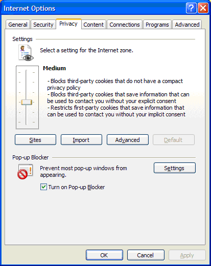 เลือกที่เมนู Tools (ทูล/แถบเครื่องมือ) แล้วเลือกหัวข้อ Internet Options เลือกที่แท๊บ Privacy (ไฟเวซี่)เลือกระดับที่ Medium (มีเดี่ยม/ระดับกลาง) ตามรูปด้านล่าง หลังจากนั้นกด OK นะครับ