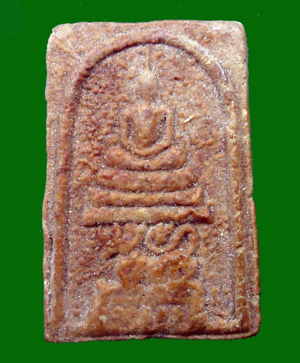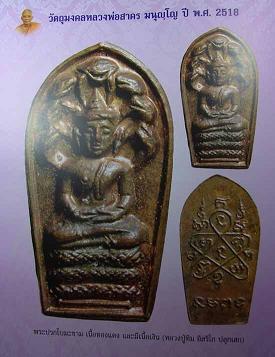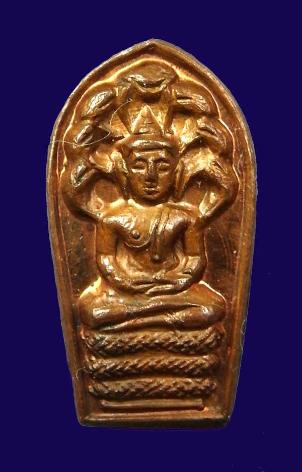 พระนาคปรกใบมะขาม เนื้อทองแดงขนาดประมาณ ความสูง 1.3 ซม. ส่วนกว้างสุด 0.7 ซม. ด้านหน้าเป็นรูปพระพุทธปางนาคปรกสามชั้น. ด้านหลังเป็นยันต์พระพุทธเจ้าห้าพระองค์นะโมพุทธายะ มีนะอยู่กึ่งกลางยันต์ อีกตัวหนึ่งแซมข้างด้านบนด้วยอิ สวา สุ ประดับข้างด้านล่างด้วยมะอะอุ และใต้ยันต์เป็นนะมะพะทะ. รูปลักษณ์ด้านหน้าของพระปรกใบมะขามนี้ คล้ายคลึงกับพระนาคปรกใบมะขามของพระราชสังวราภิมณฑ์(หลวงปู่โต๊ะ อินทสุวัณโณ) วัดประดู่ฉิมพลี กรุงเทพฯ(ที่สร้างในภายหลัง)มาก แต่พระของหลวงปู่โต๊ะมีความหนาและขนาดเขื่องกว่าเล็กน้อย ด้วยความประพิมพ์ประพายใกล้เคียงกันจึงชวนให้สันนิษฐานว่า ช่างแกะแม่พิมพ์คงเป็นบุคคลเดียวกัน