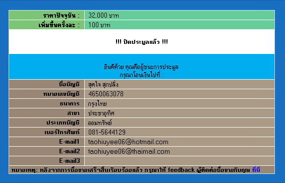 ผมว่าเธอคงไม่รู้เรื่องอีกตามเคย แต่จับได้ ก็สาวถึงตัวหลอกลวงนี่แหละครับ มันอยู่กรุงเทพ แต่ชอบบอกอยู่ต่างจังหวัดครับ ตอนนี้มันก็คงอ่านอยู่หน้าจอกับเรานี่แหละครับ กำลังหาเหยื่อรายใหม่ อิอิอิ ซื้อขายต่อไปคงยากขึ้นและระวังมากขึ้น Feedback เยอะไม่ได้ช่วยในการตัดสินใจนะครับ เพราะไม่ใช่ตัวจริงกับเจ้าของ ว่ะห่ะฮ่า...............ขอบคุณที่ทาง g-pra รีบดำเนินการครับผม