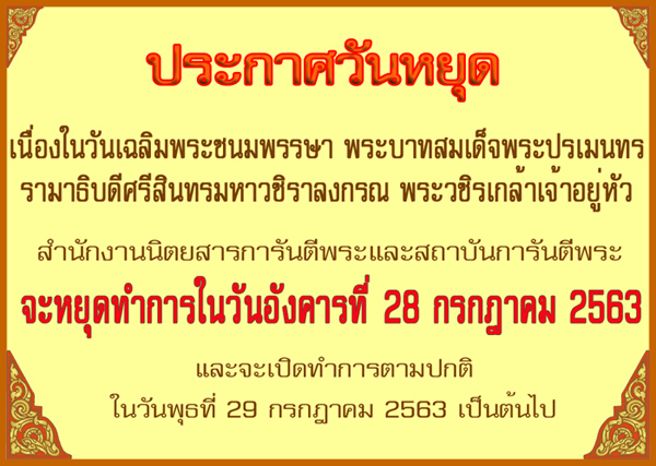 ประกาศวันหยุด 28 กรกฎาคม 2563